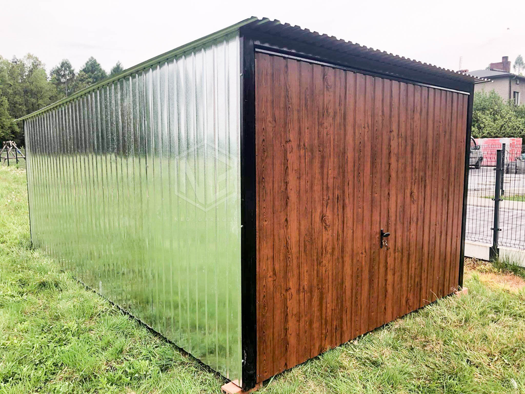 Blechgarage 3x5m – Schwingtor – Verzinkt + Dunkles Walnussholz – Pultdach GP104