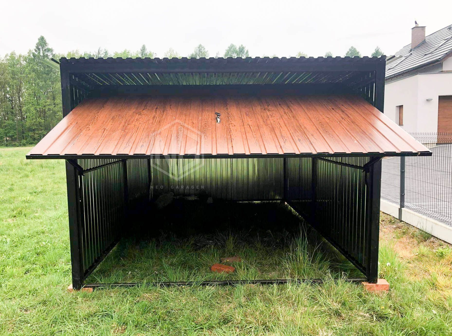 / Blechgarage 3x5m – Schwingtor – Verzinkt + Dunkles Walnussholz – Pultdach GP104