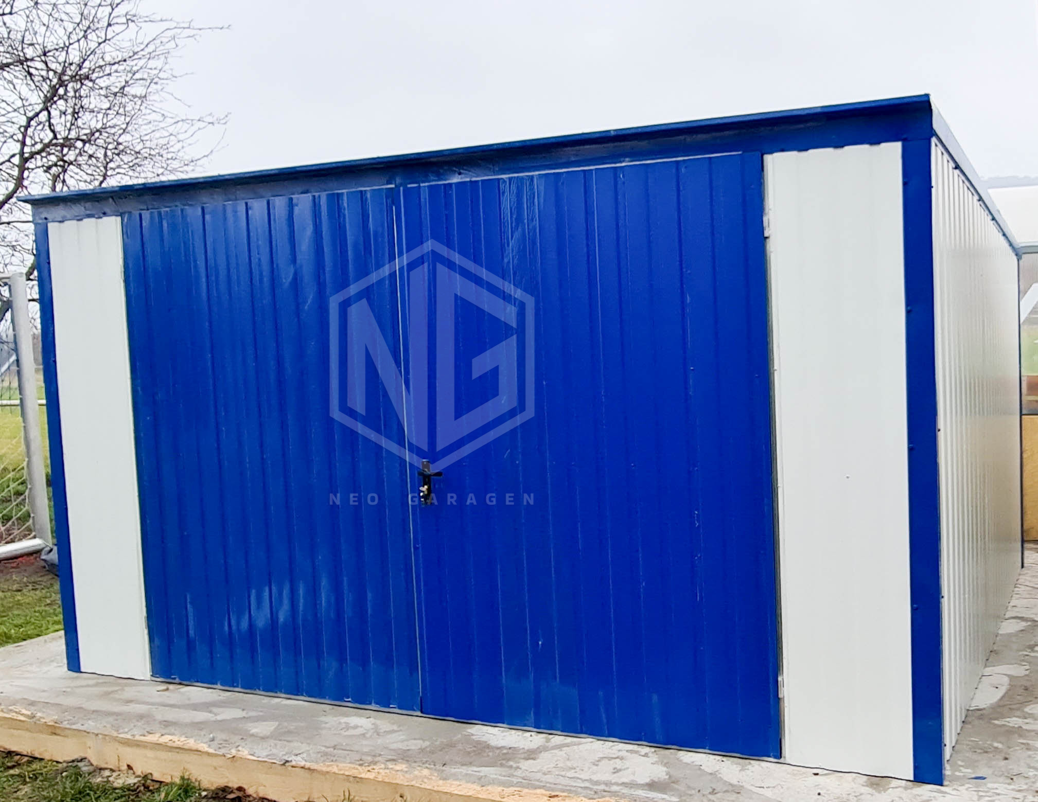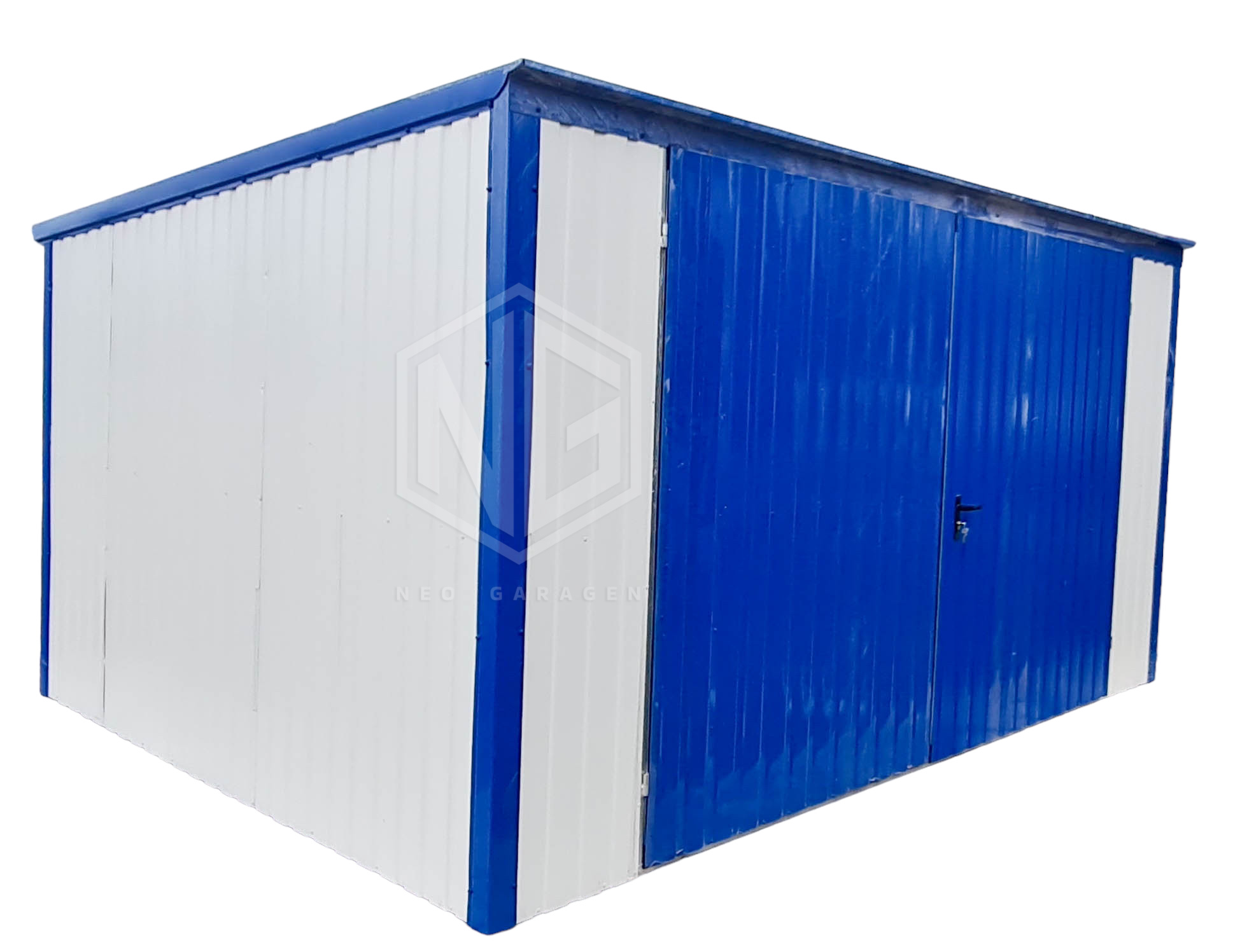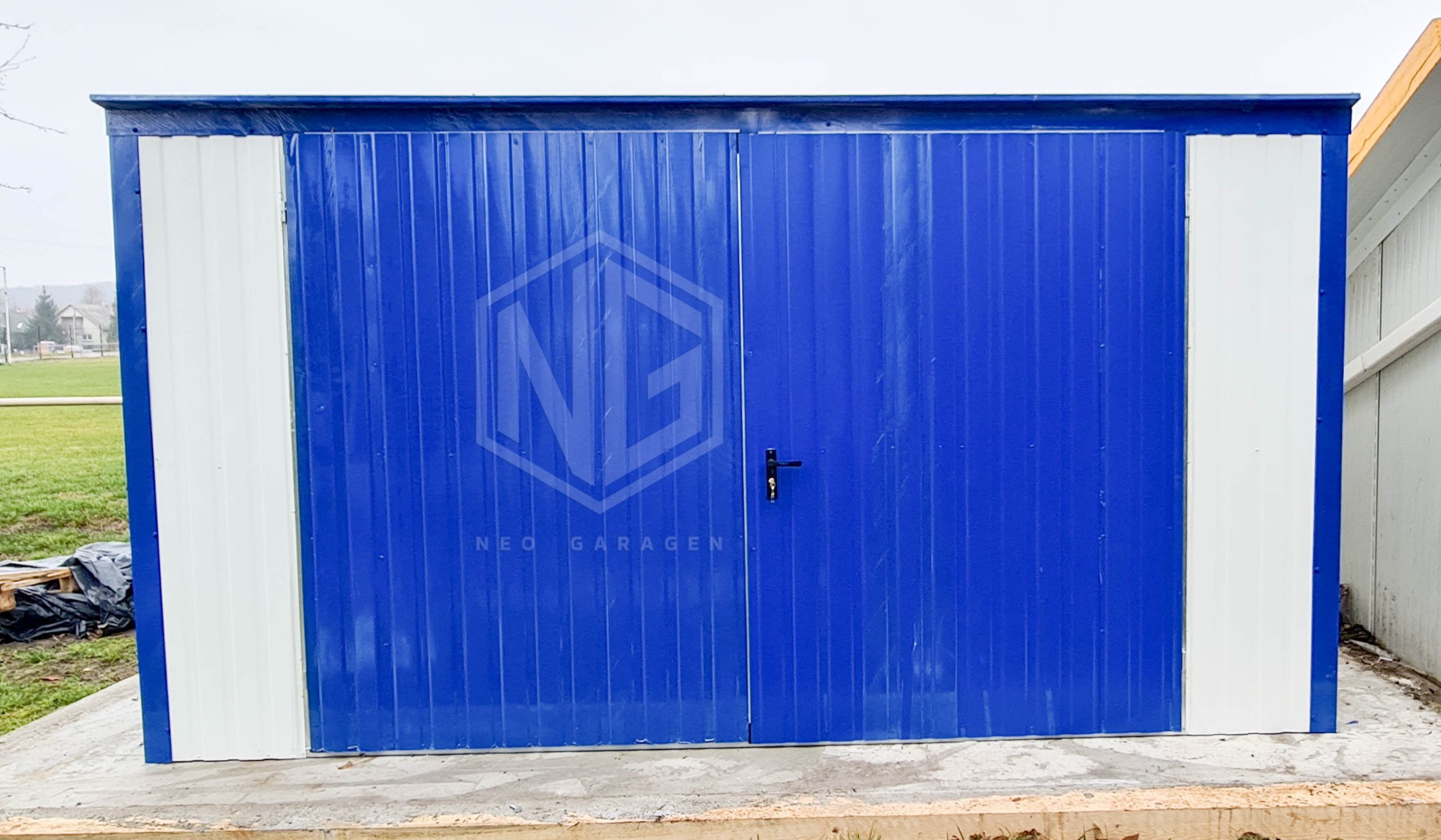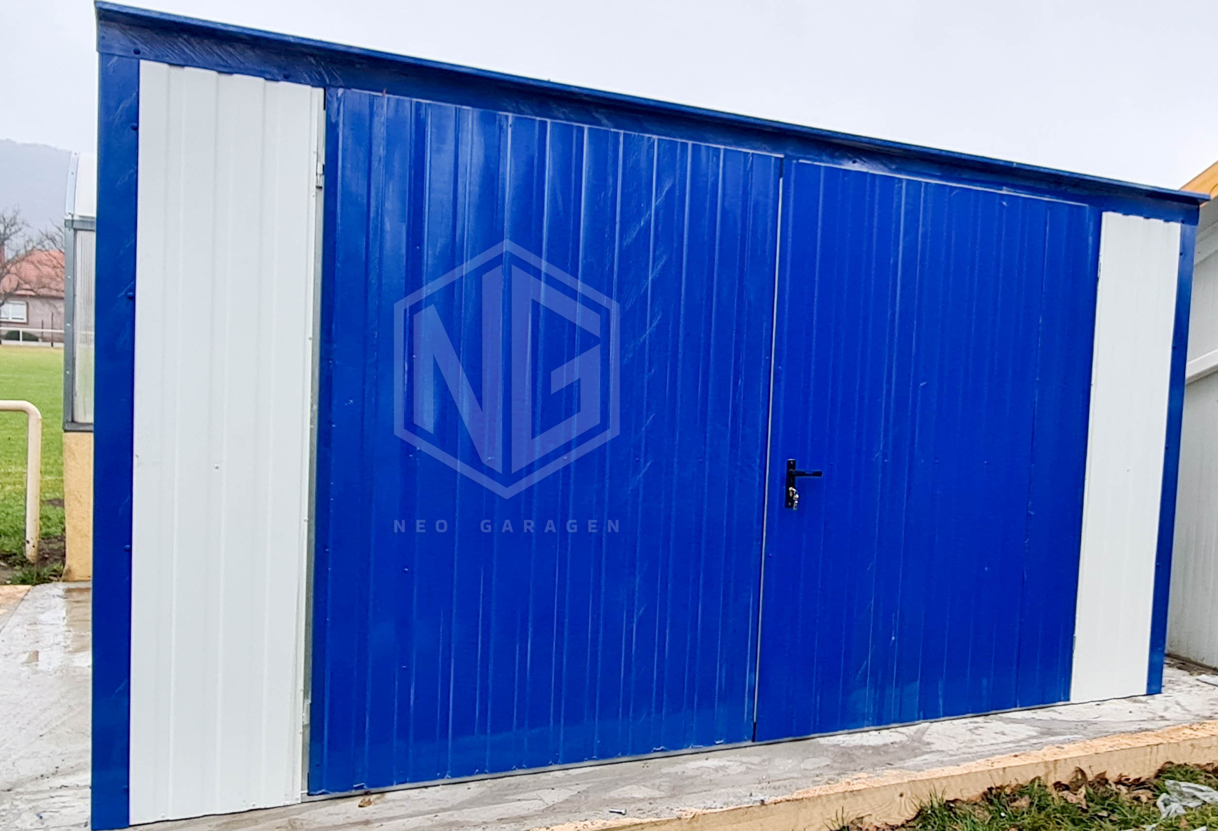 Blechgarage 4x5m Vertikal Blech Schwingtor Weiß Blau Pultdach ID157