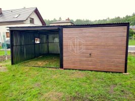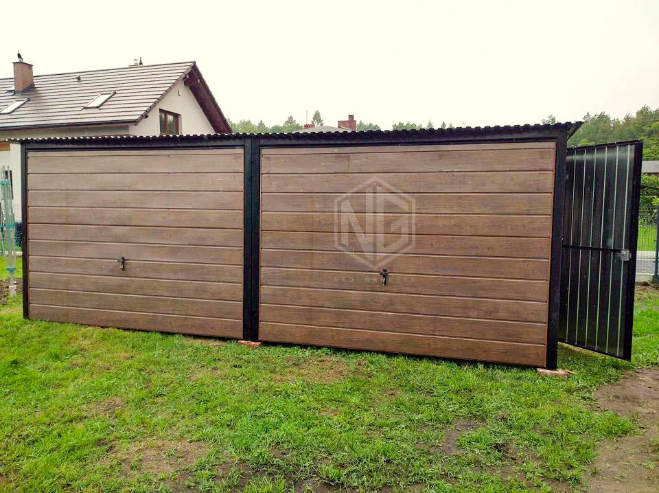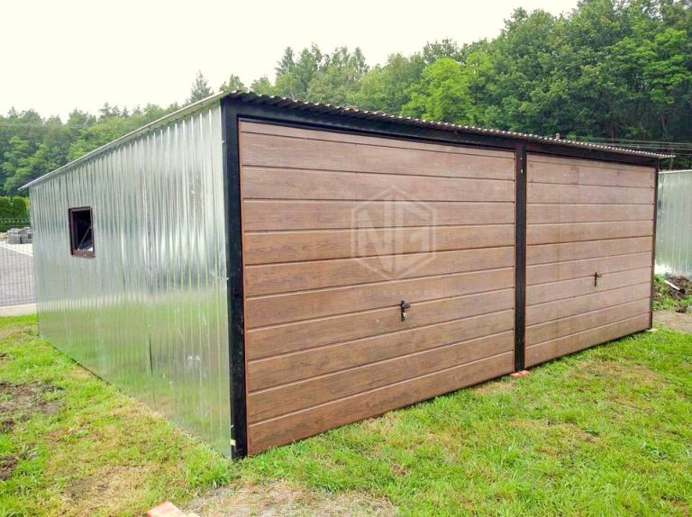 Blechgarage 6x8m – 2x Schwingtor – Zusätzliche Tür – Holzoptik + PVC Kippfenster – Verzinkt – Pultdach  GP141
