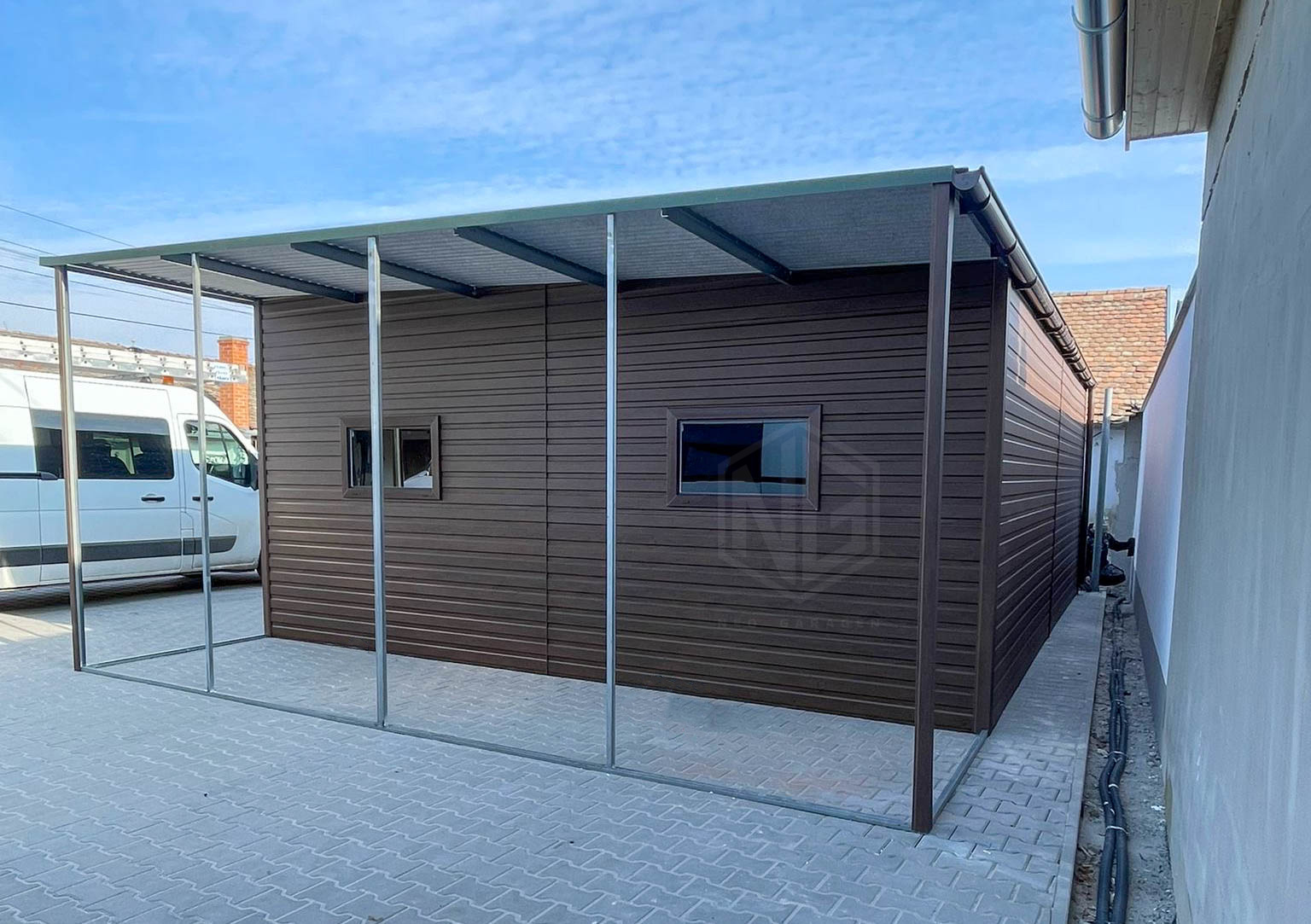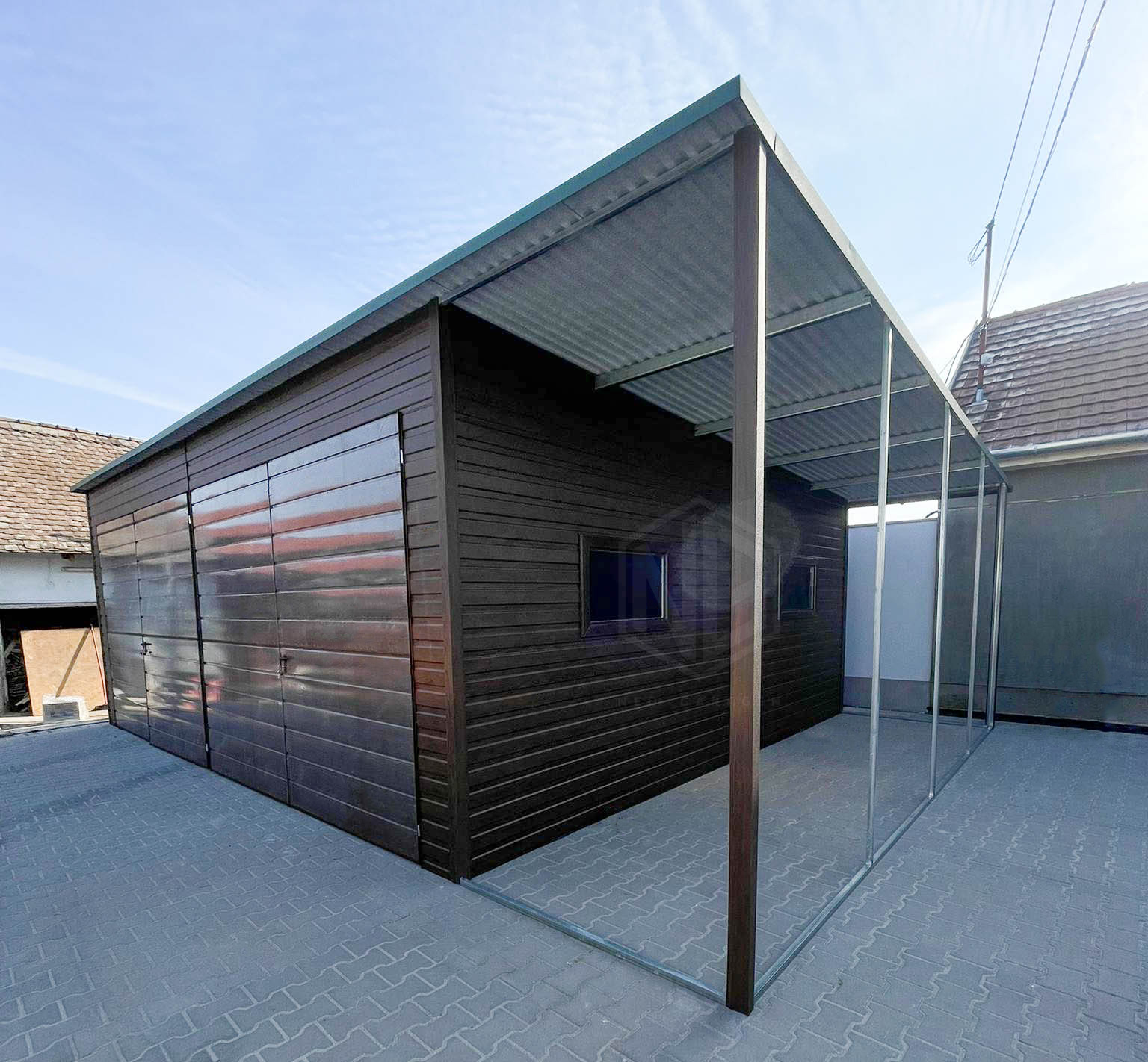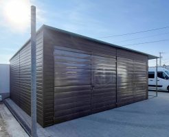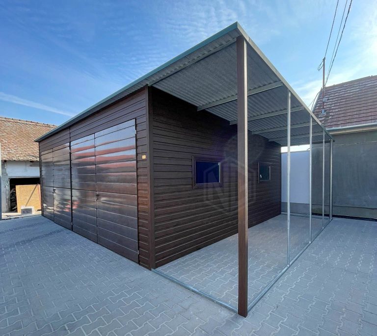 Blechgarage 7x6m + Überdachung 1,6m – 2x Zweiflügeliges Tor – 2x PVC Kippfenster – Holzoptik – Flachdach ID936