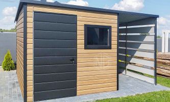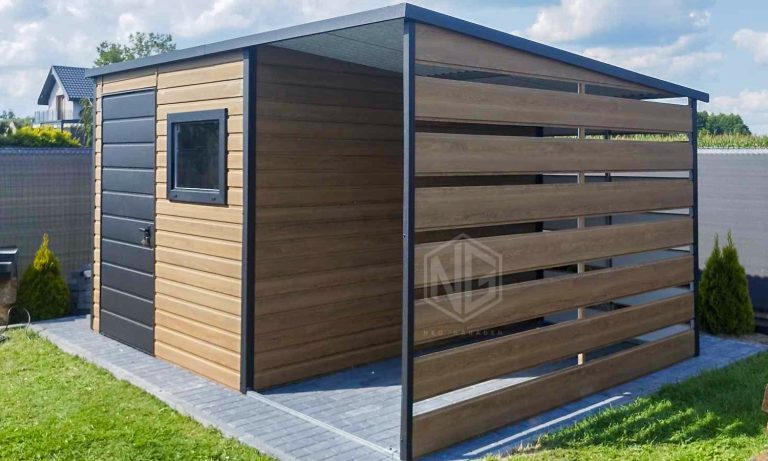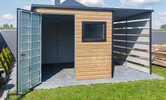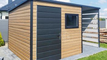 Gartenhaus – Gartenschuppen 2,5×2,5m + Überdachung 1,2m – Tür – PVC Kippfenster – Winchester – Holzoptik – Flachdach ID669
