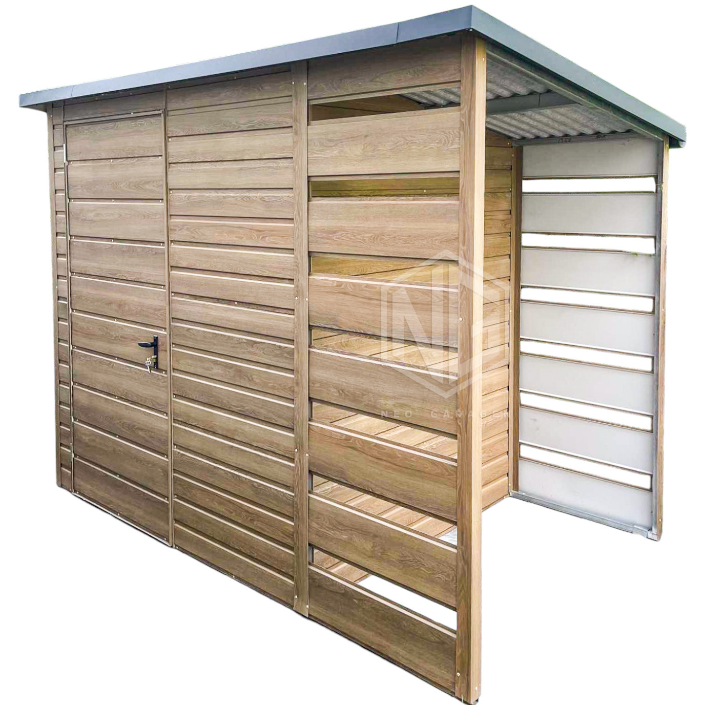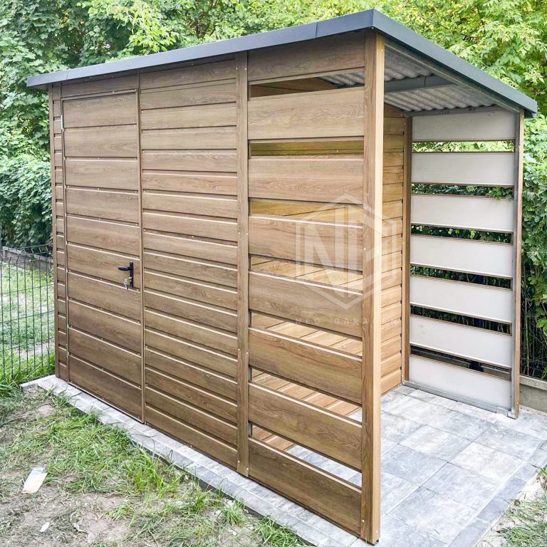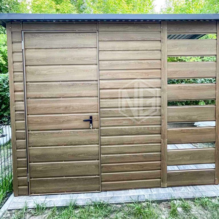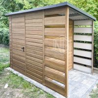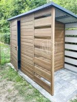 Gartenhaus – Gartenschuppen 2×1,5m + Überdachung 0,8m – Tür – Winchester – Holzoptik – Flachdach ID668