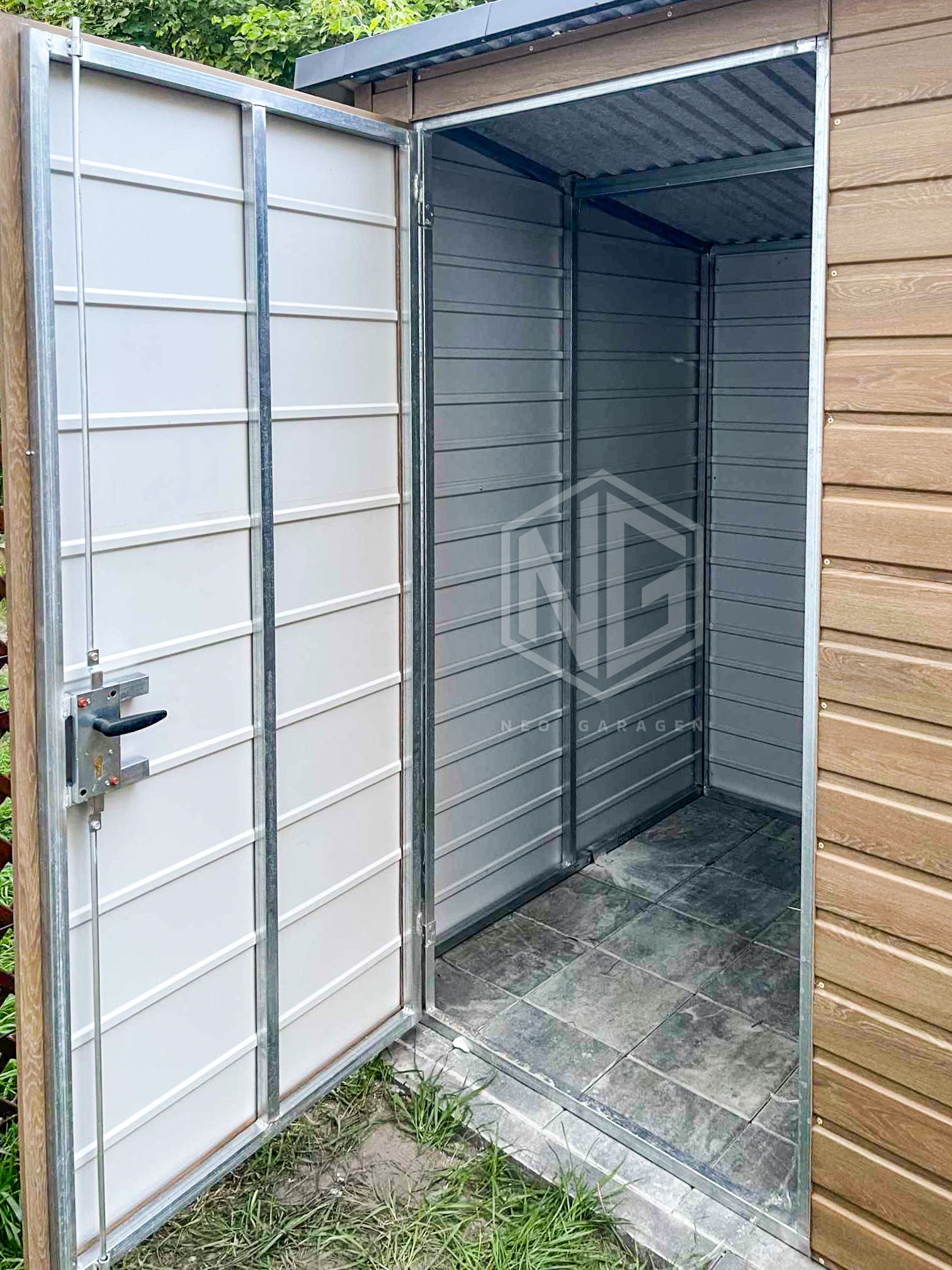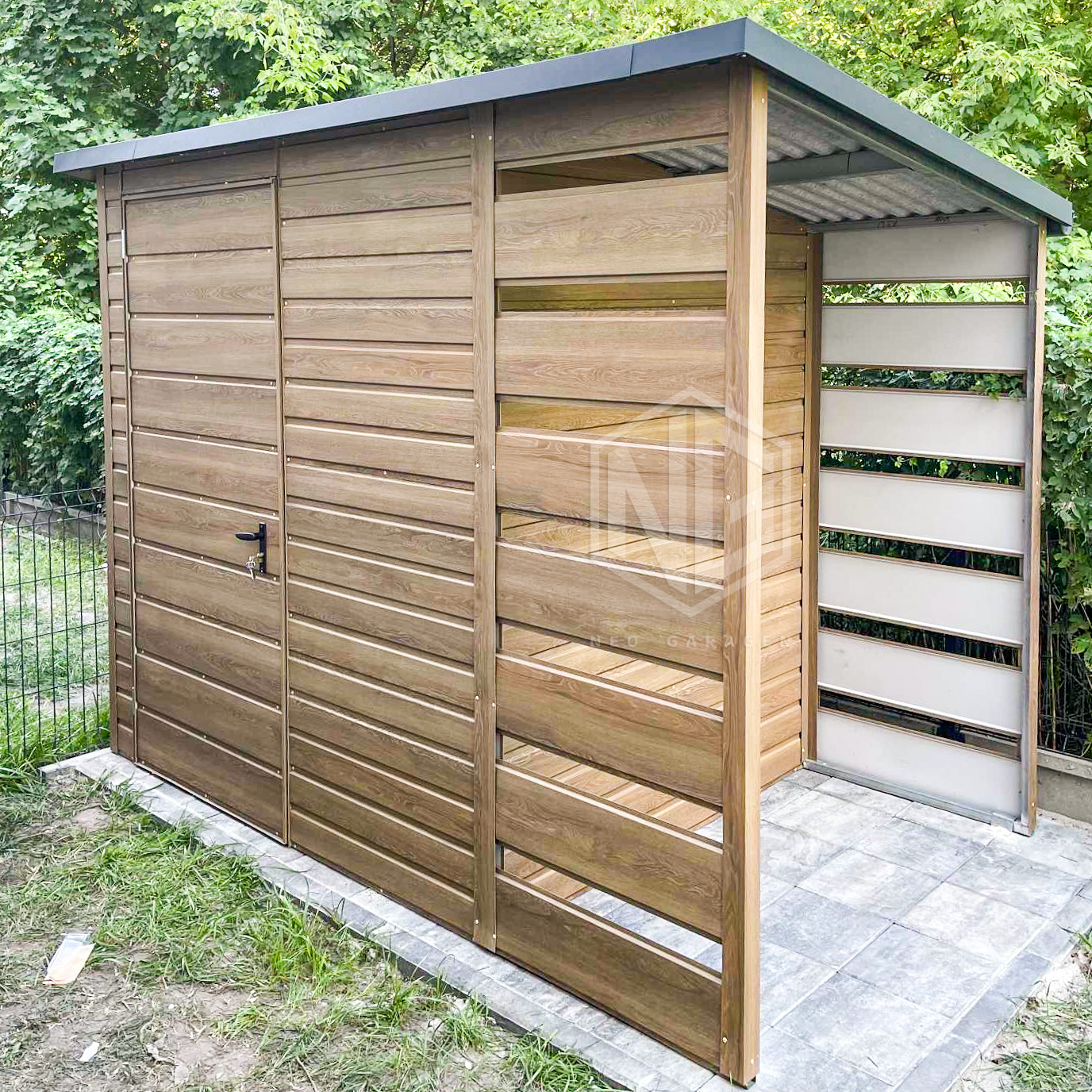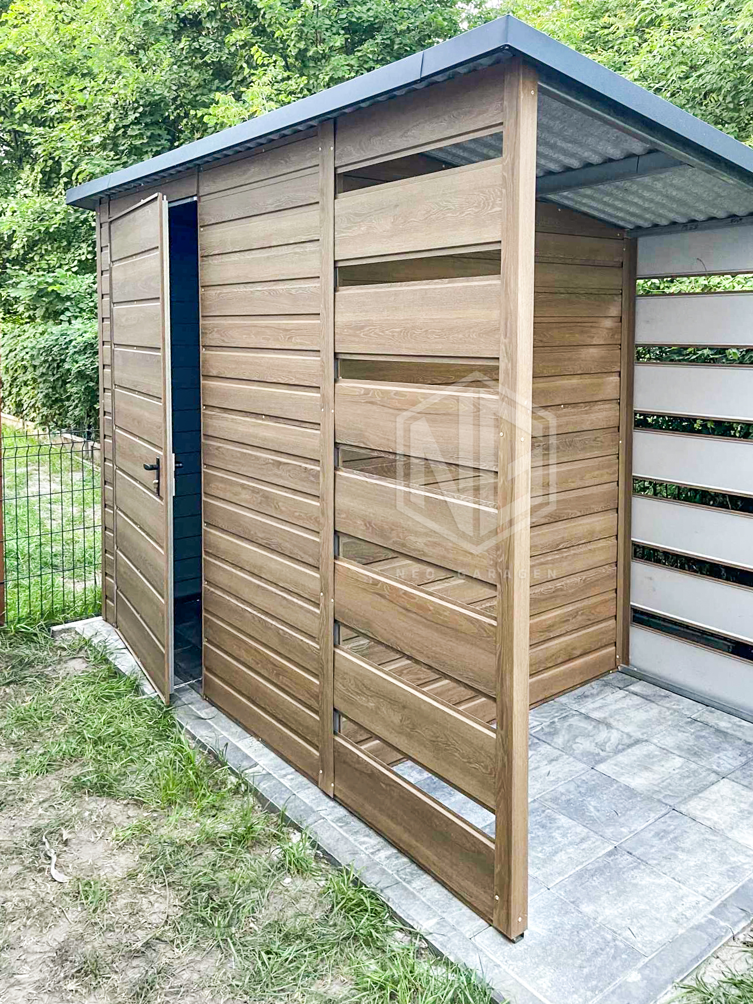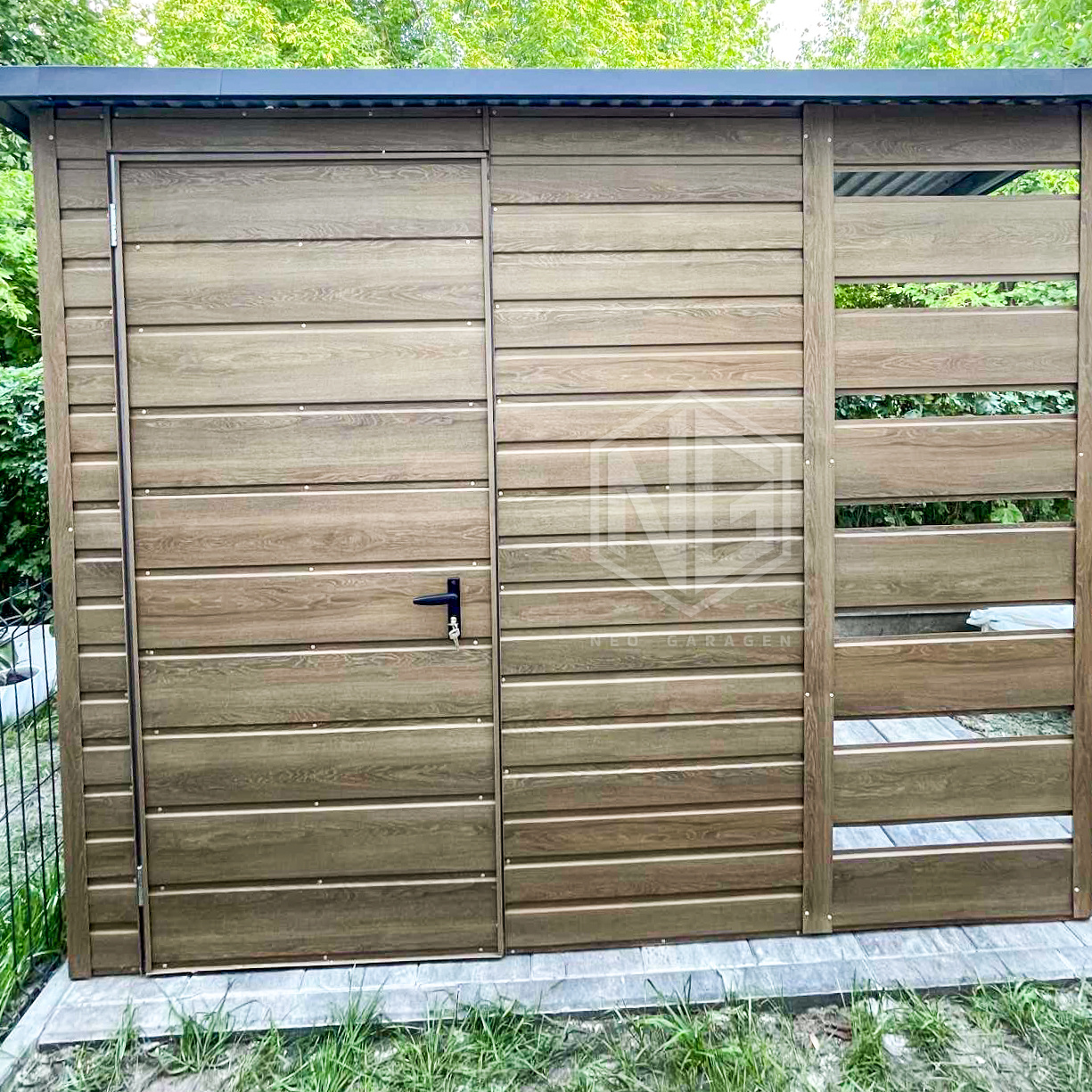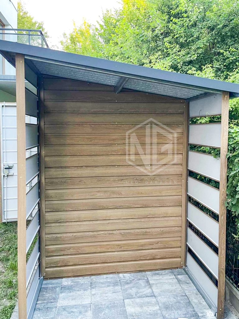 • Überdachung 0,8×1,5m Die Rück- und Vorderwand sind mit Paneelen verkleidet.