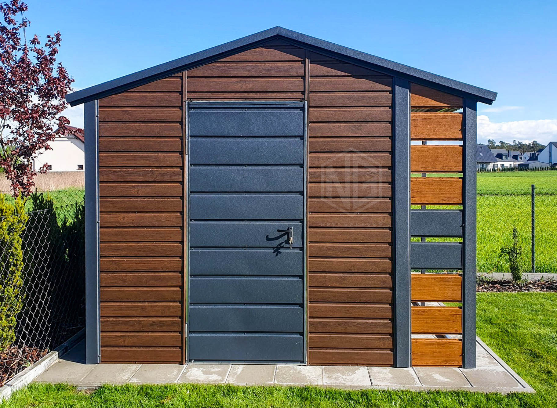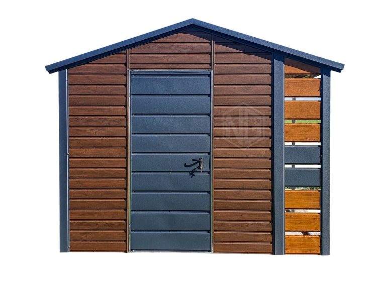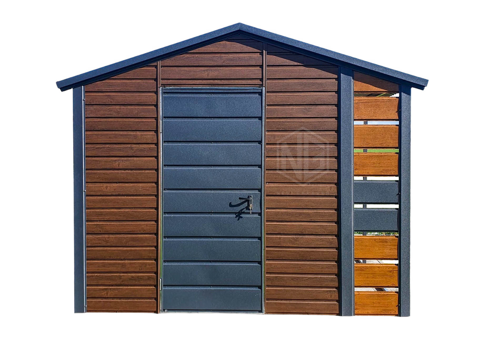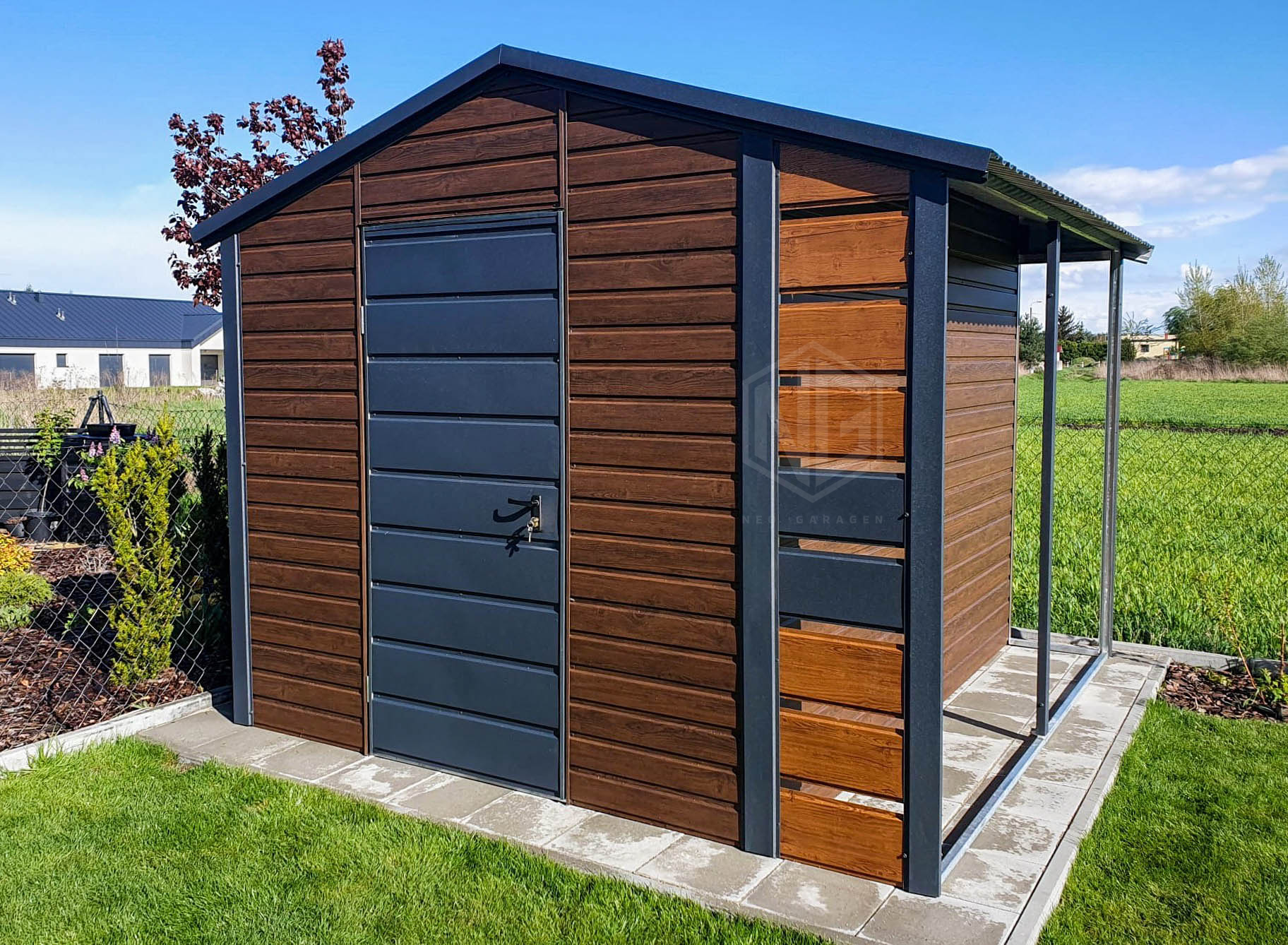 Gartenhaus – Gartenschuppen 2×2,5m + Überdachung 0,5m – Tür -Dunkles Walnussholz – Helles Walnussholz – Holzoptik – Satteldach ID629