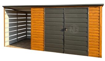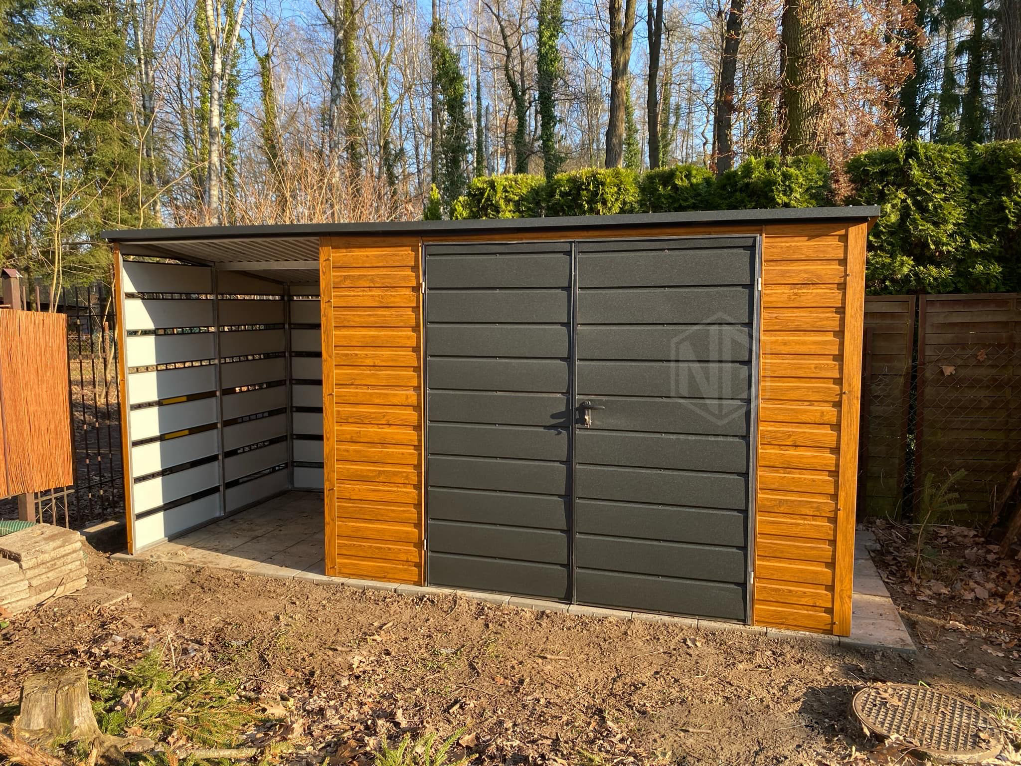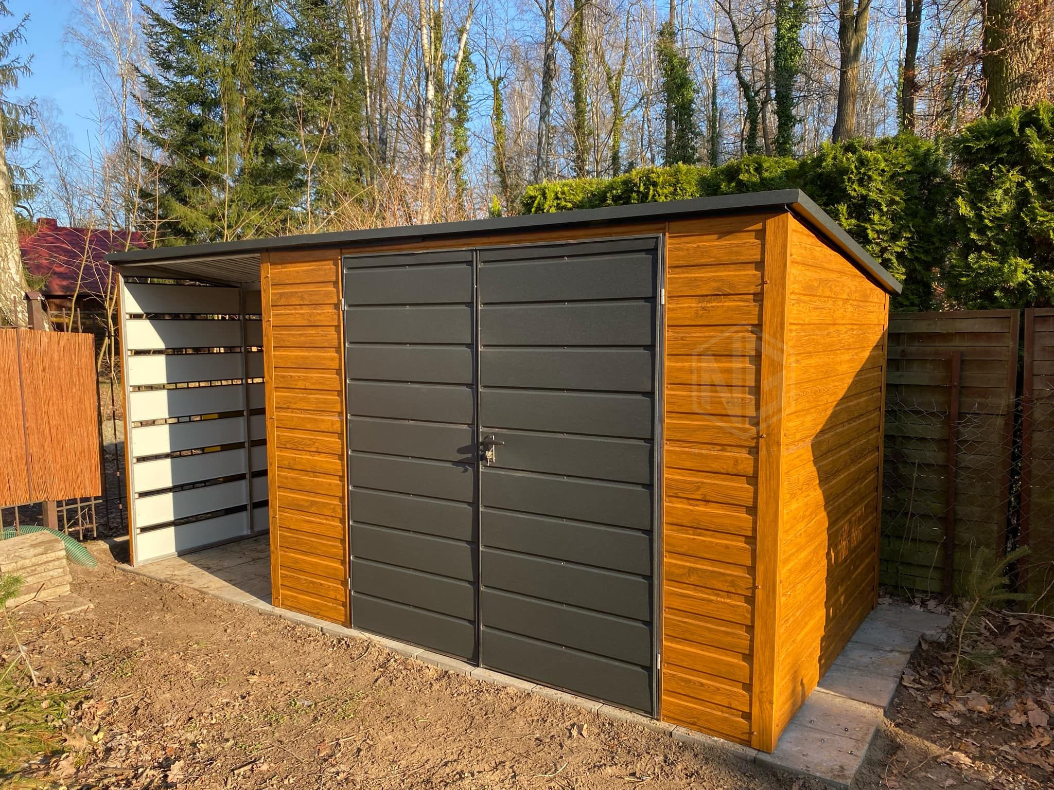 Gartenhaus – Gartenschuppen 3x2m + Überdachung 1,5m – Zweiflügeliges Tor – Holzoptik – Flachdach GP559
