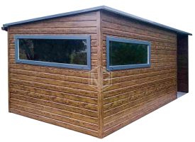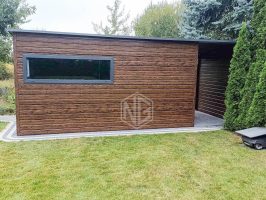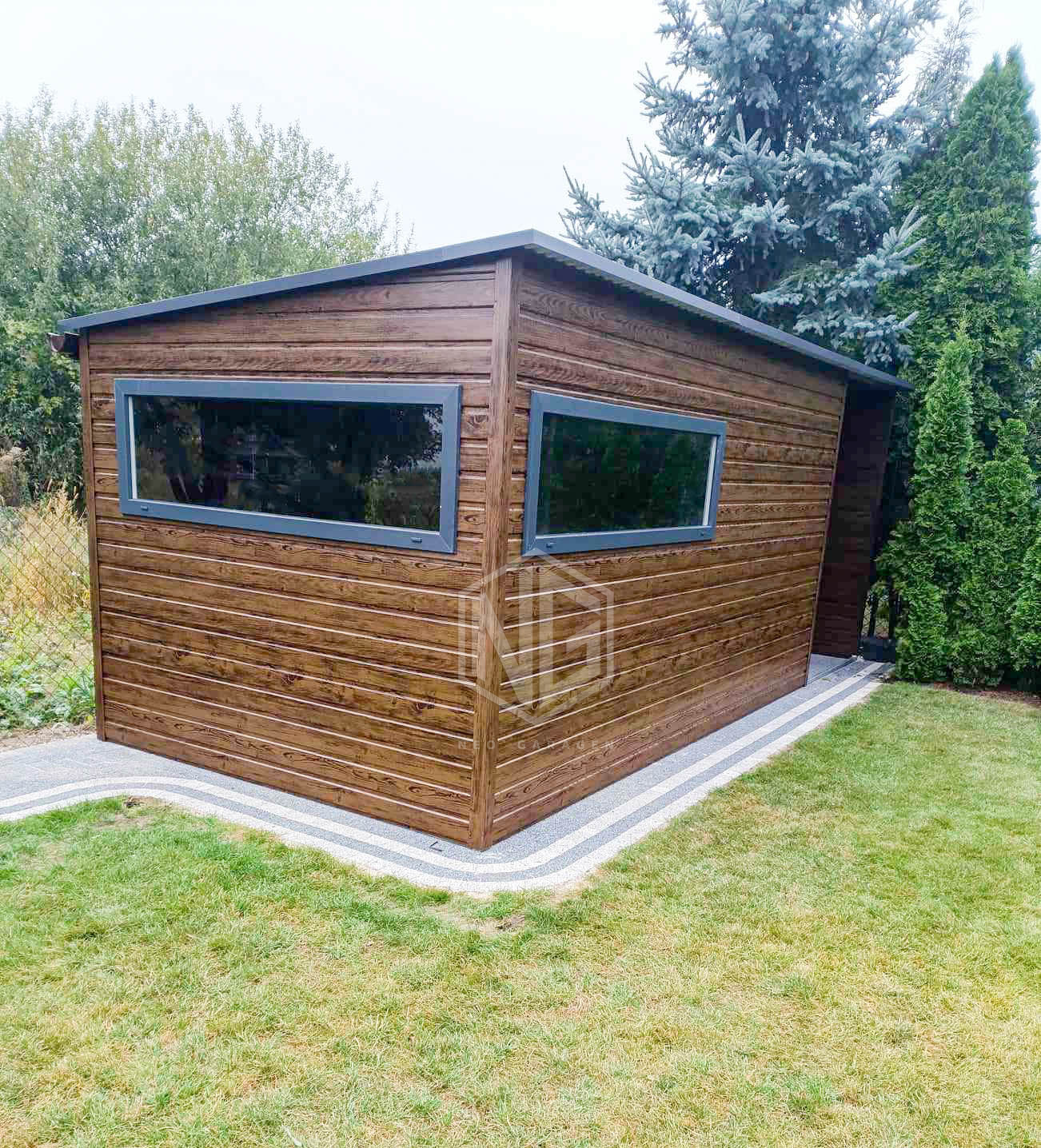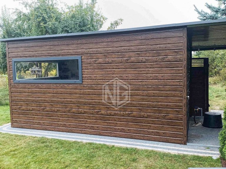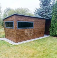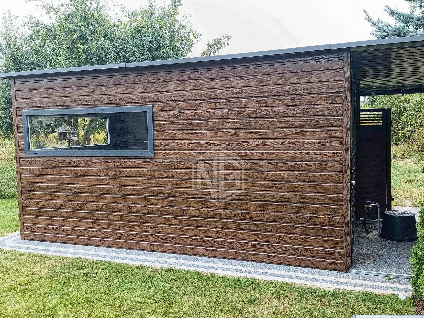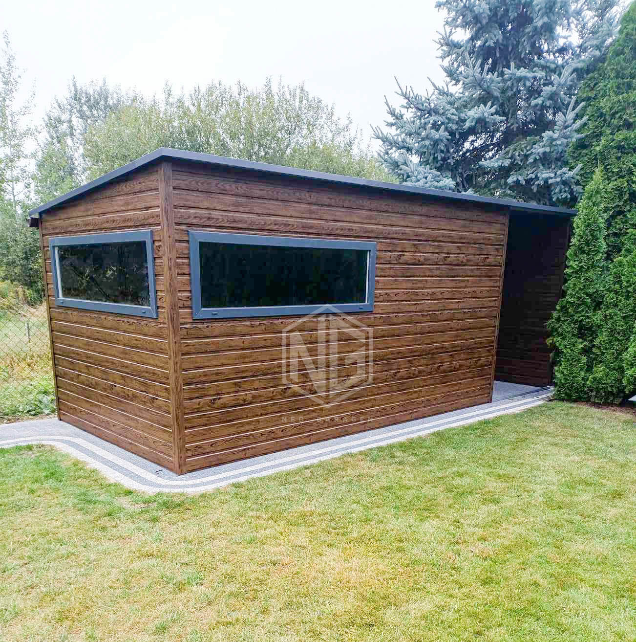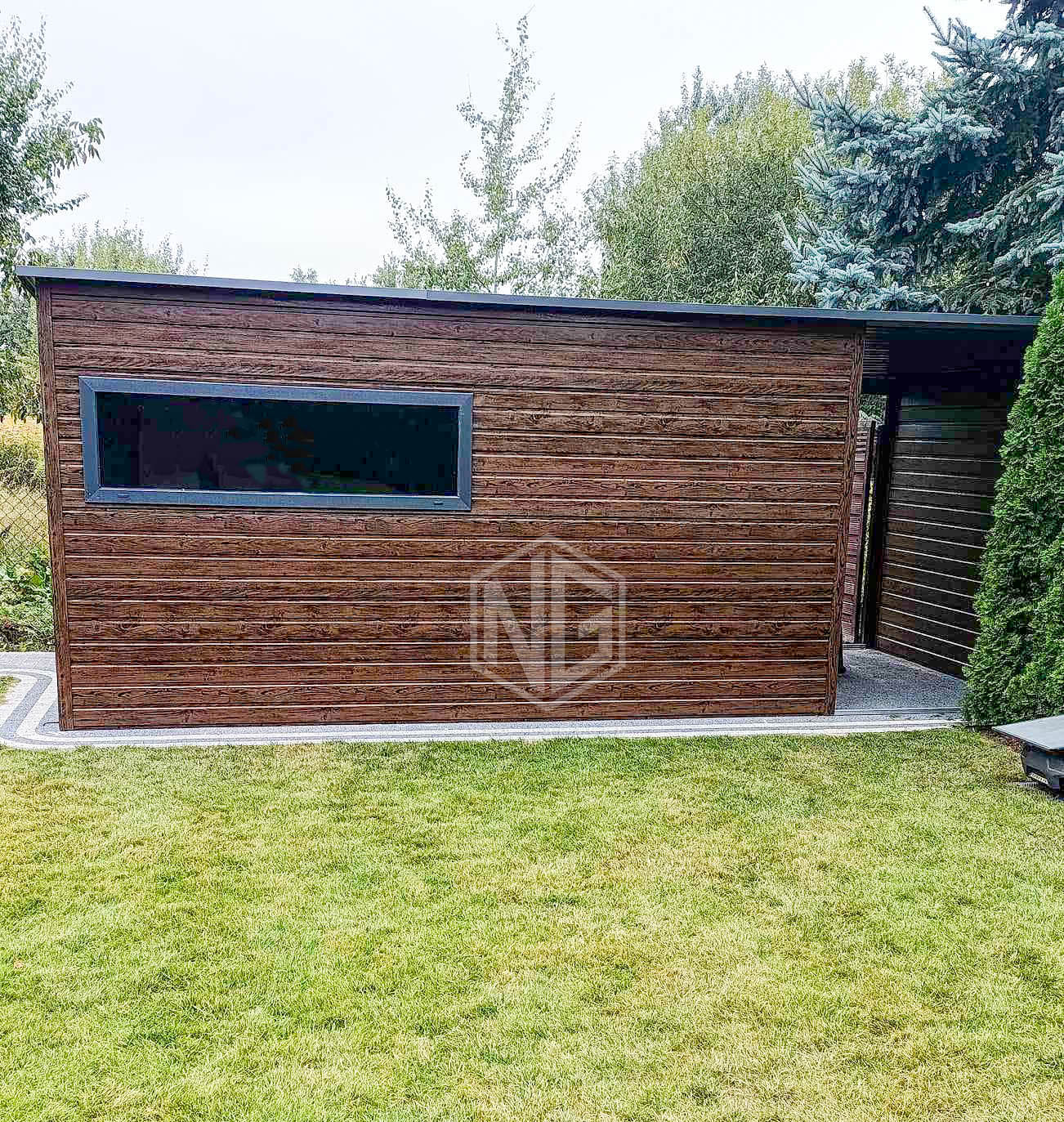 Gartenhaus – Gartenschuppen 4,5×2,5m + Überdachung 1,8m – Tür – 2x PVC Kippfenster – Holzoptik – Anthrazit – Dachrinnen – Flachdach ID813