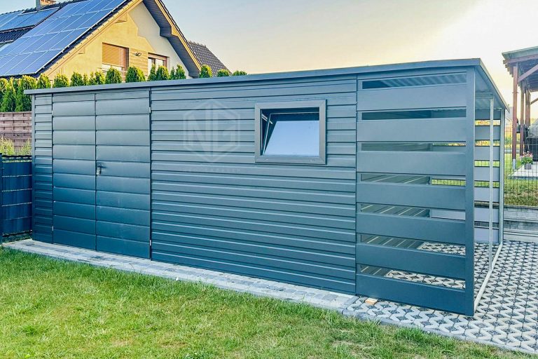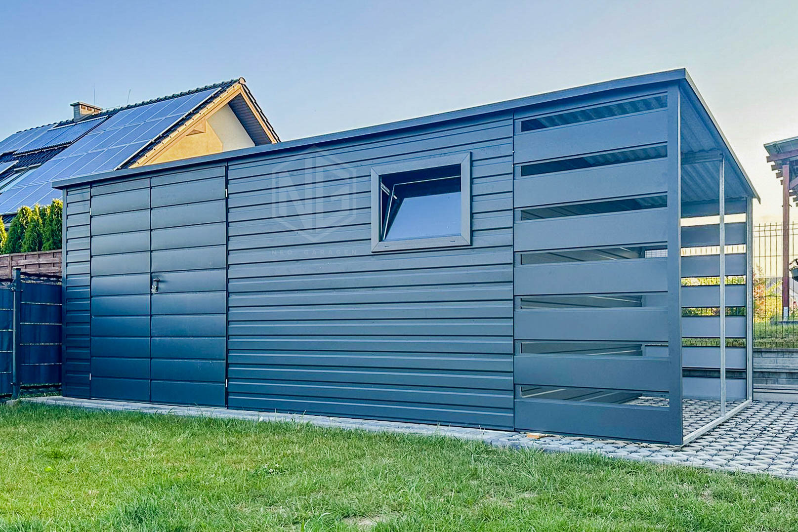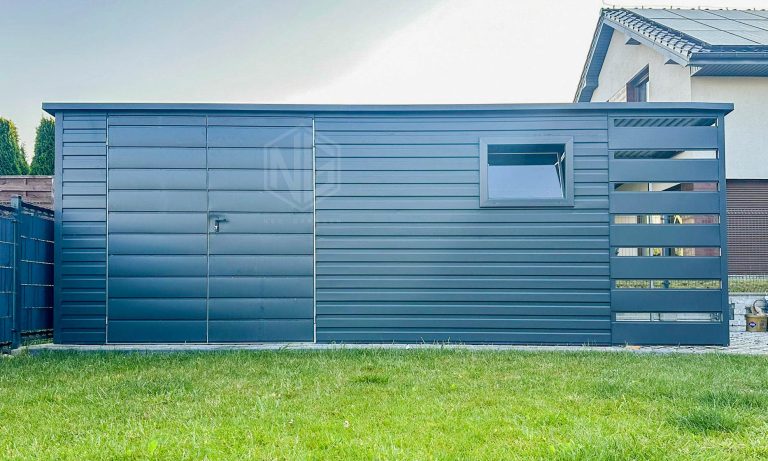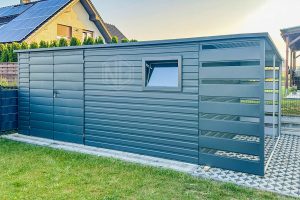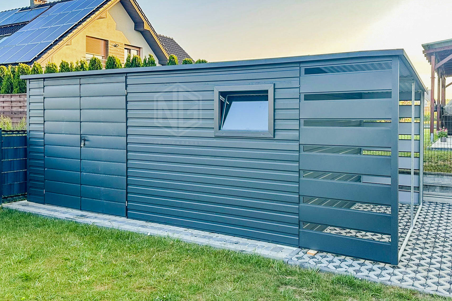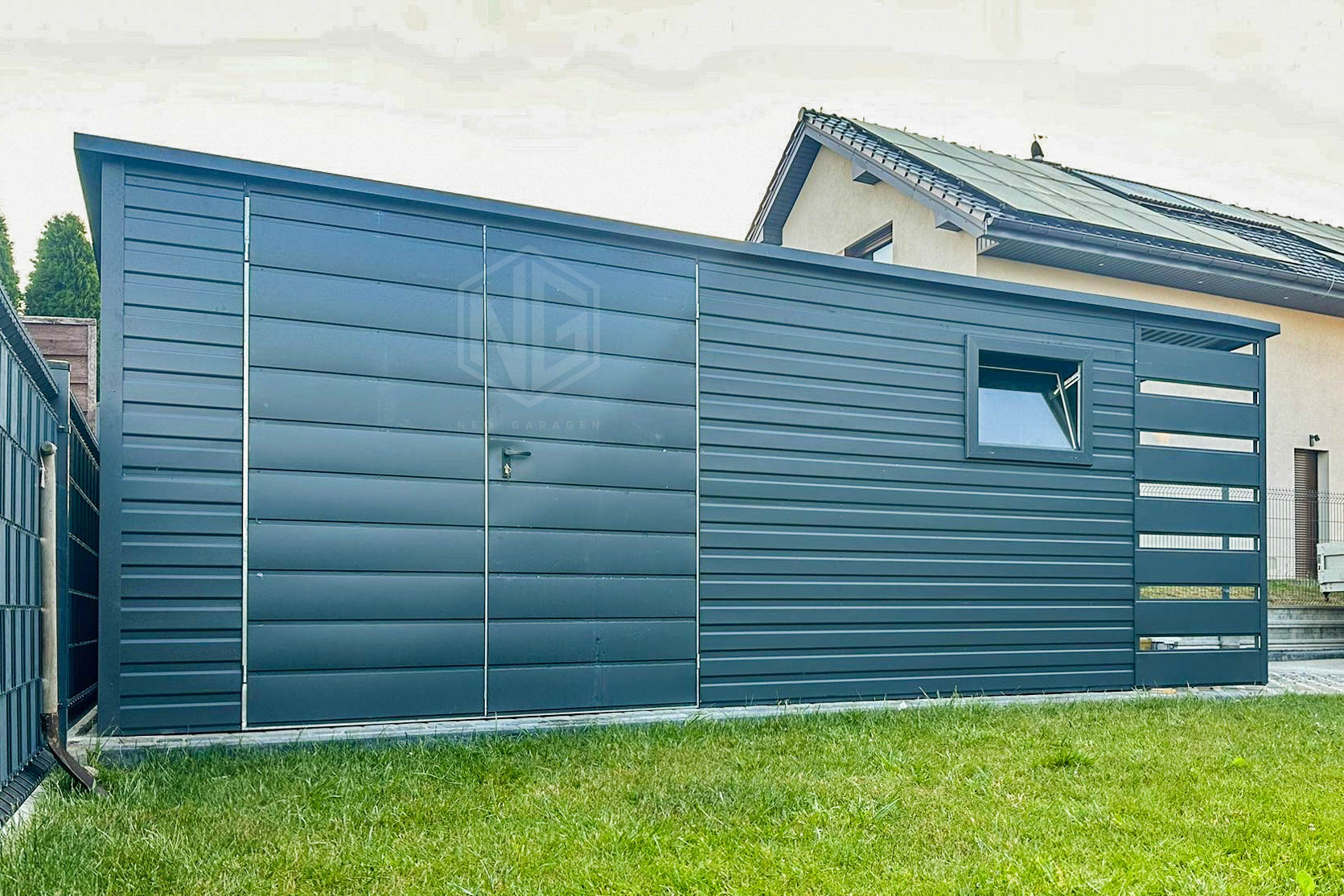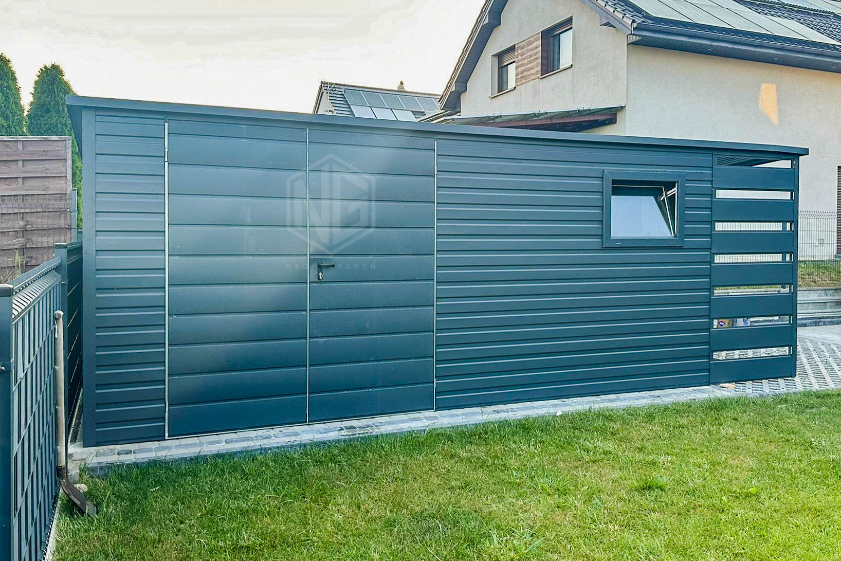 Gartenhaus – Gartenschuppen 4,5x2m + Überdachung 1m – Zweiflügeliges Tor – PVC Kippfenster – Anthrazit – Flachdach ID617