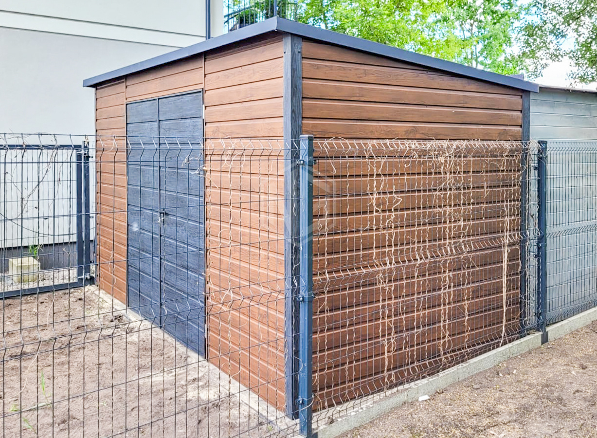 Gartenhaus – Gartenschuppen 4×2,5 – Zweiflügeliges Tor – Norwegische Kiefer – Helles Walnussholz – Holzoptik – Flachdach ID610