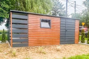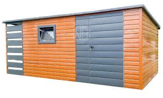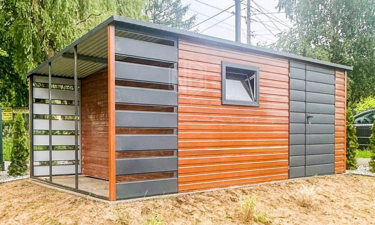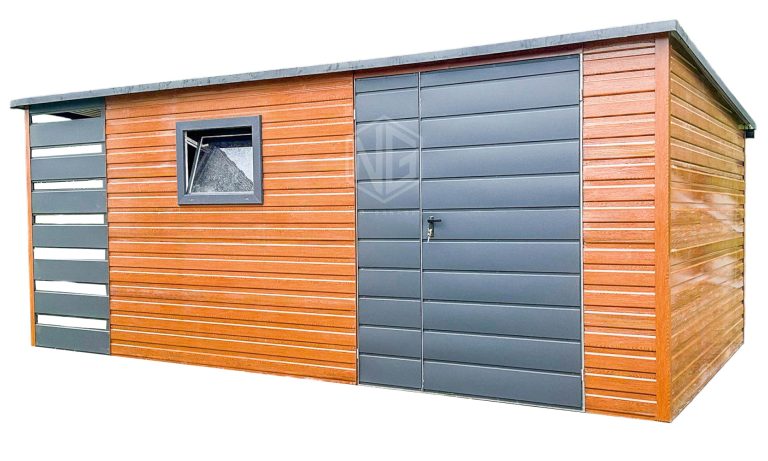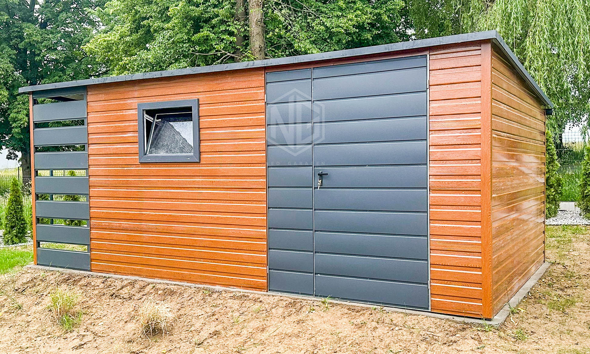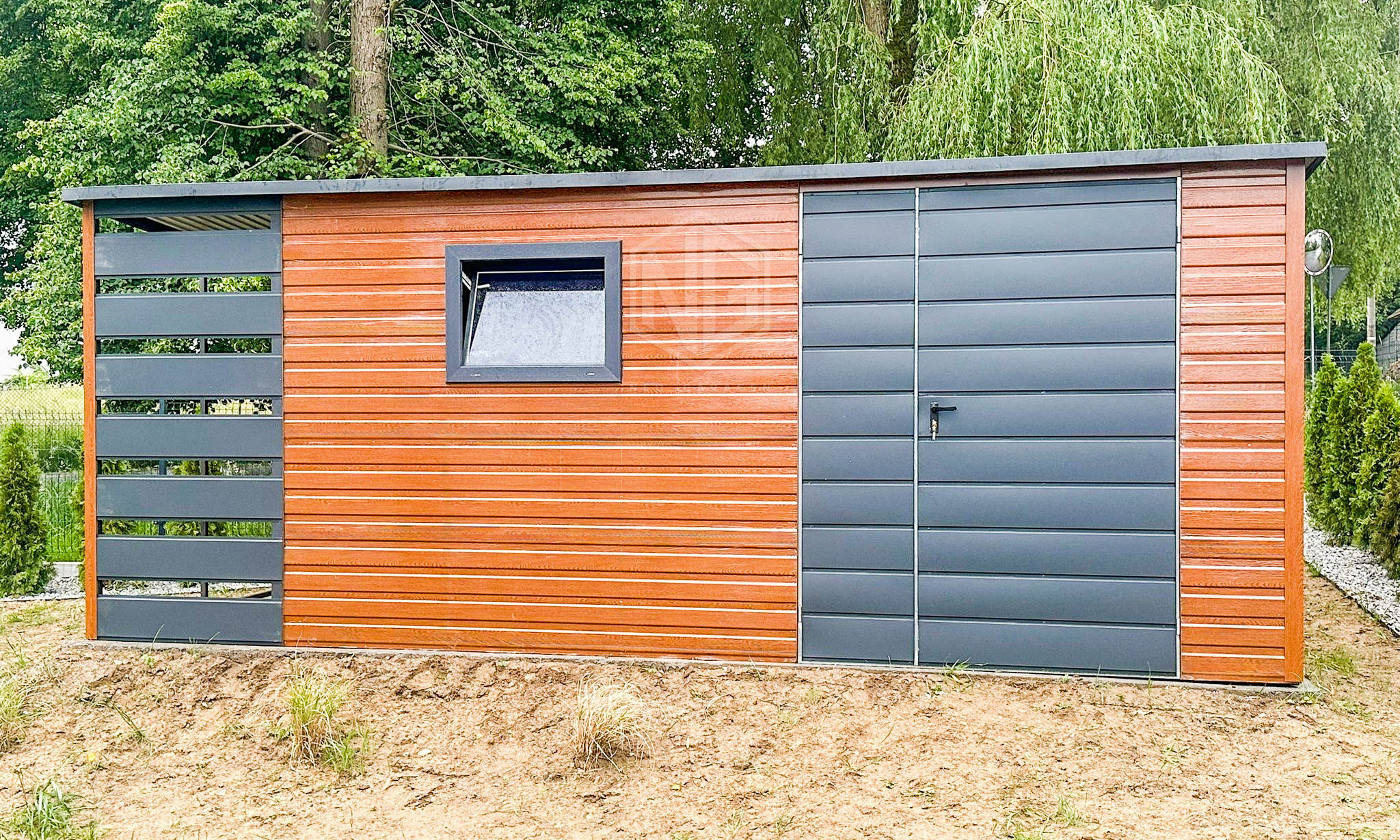 Gartenhaus – Gartenschuppen 4×2,5m + Überdachung 1m – PVC Kippfenster – Zweiflügeliges Tor – Goldene Eiche – Holzoptik – Anthrazit – Flachdach ID618