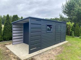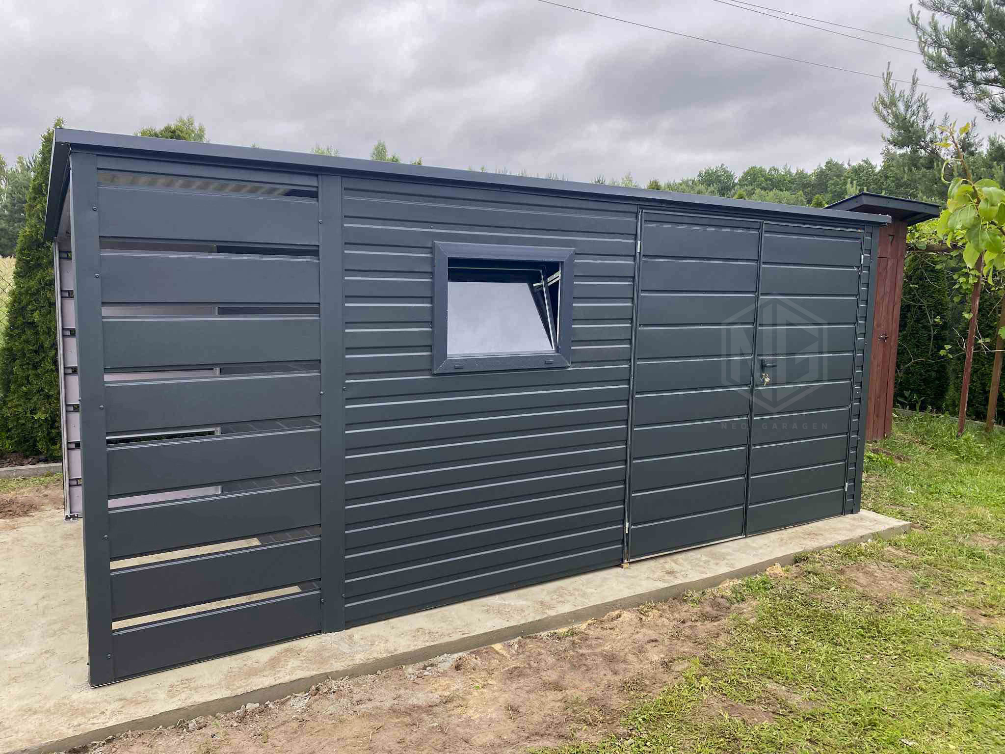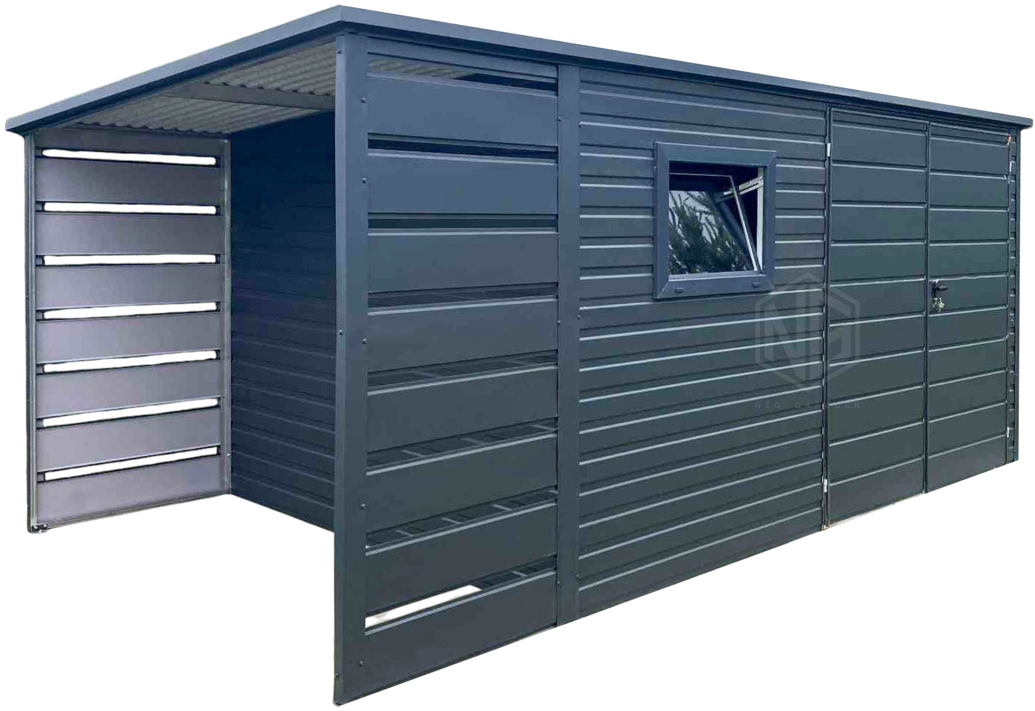 Gartenhaus – Gartenschuppen 4×2,5m + Überdachung 1m – Zweiflügeliges Tor – PVC Kippfenster – Anthrazit – Flachdach | GP567 |