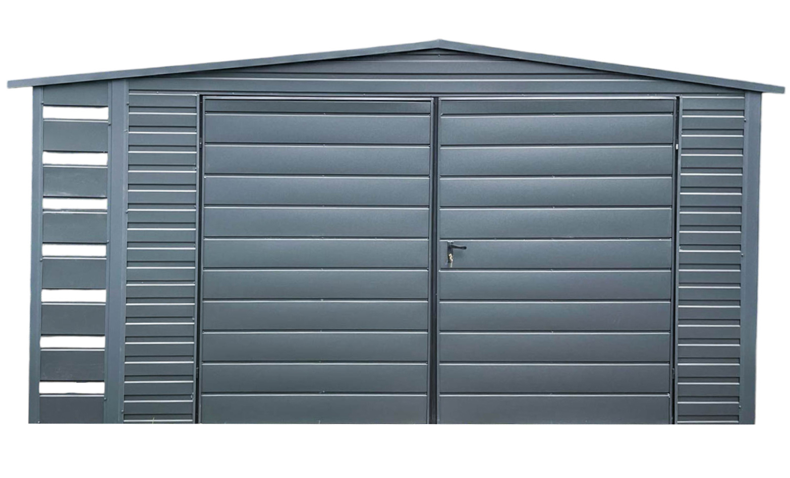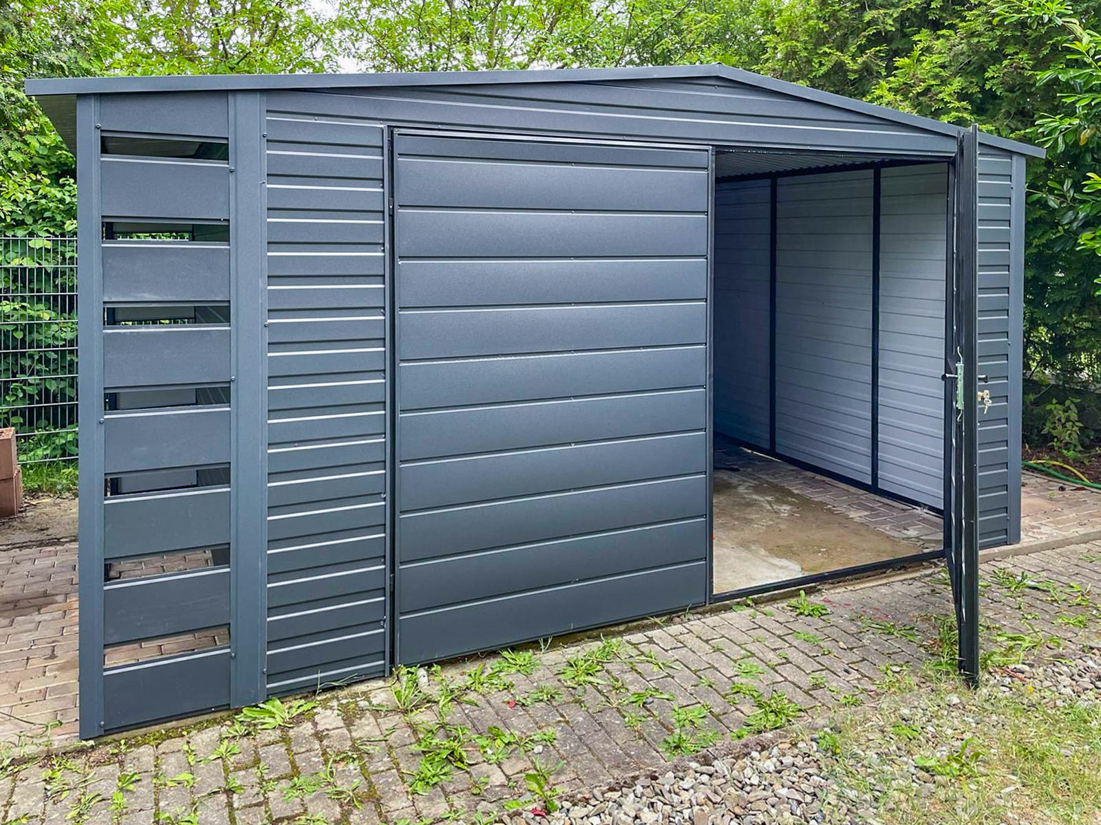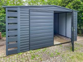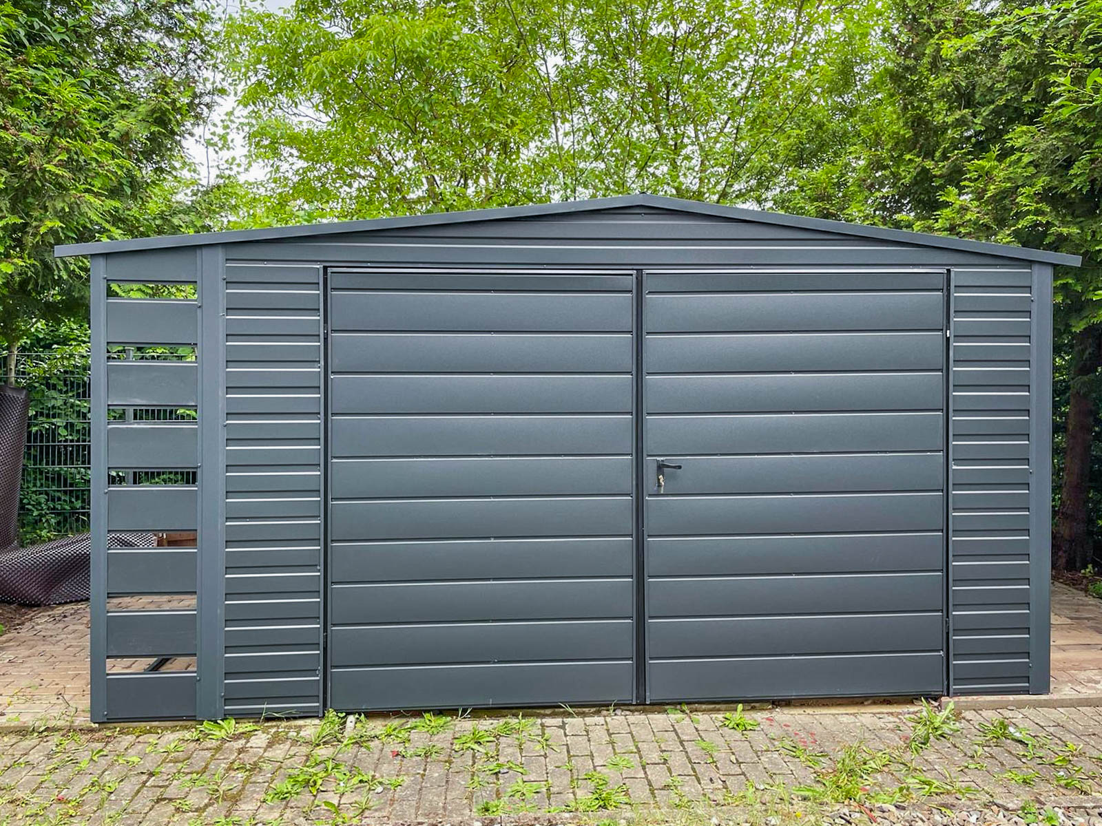 Gartenhaus – Gartenschuppen 4x3m + Überdachung 0,5m – Zweiflügeliges Tor – Anthrazit – Flachdach GP419
