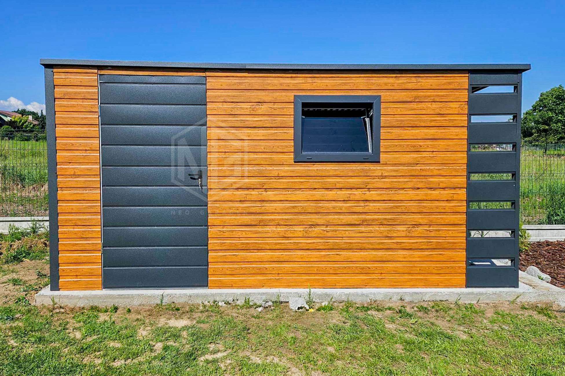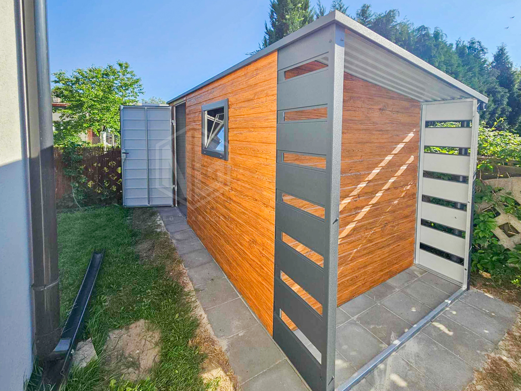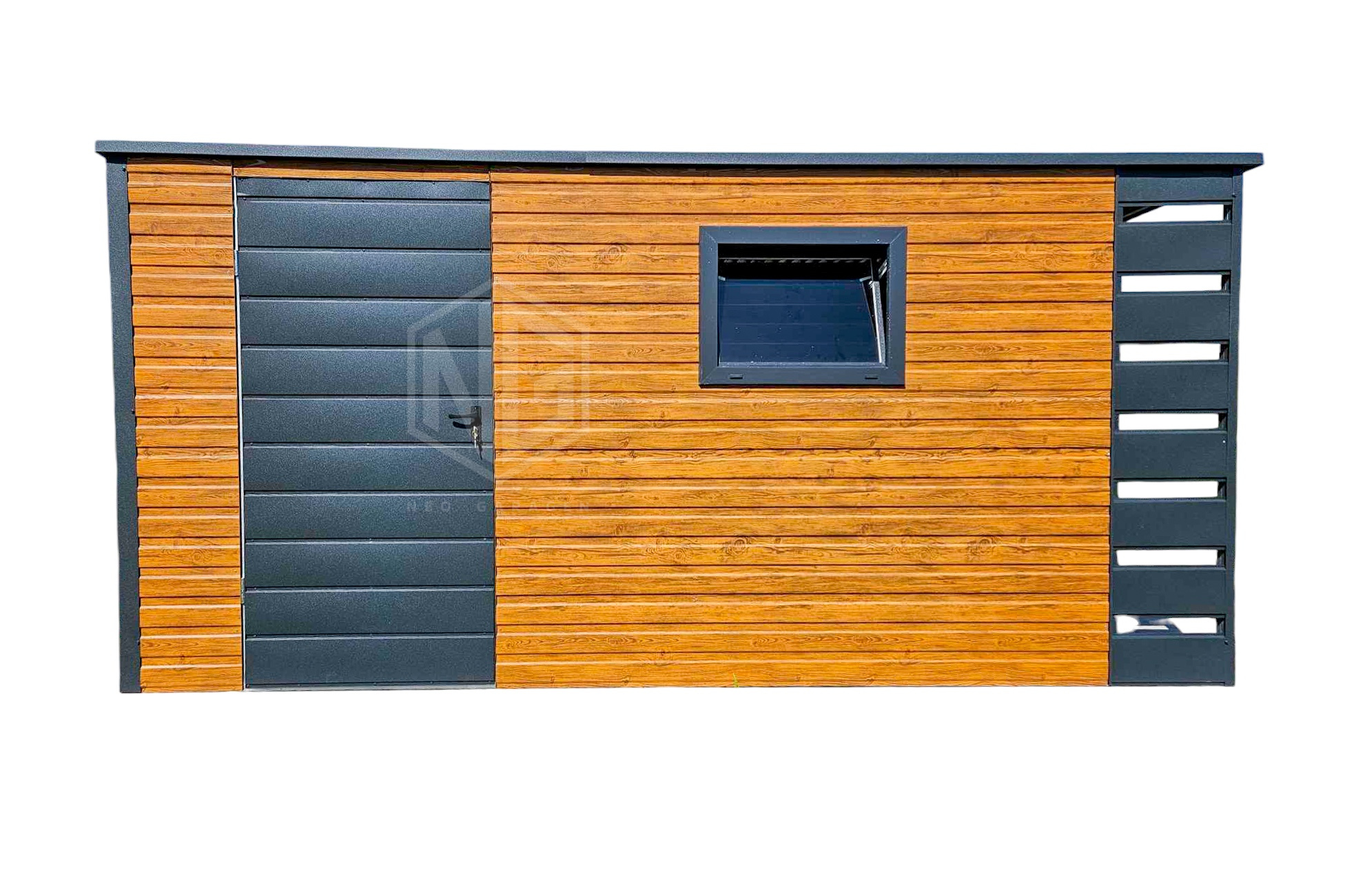 Gartenhaus – Schuppen 4,5x2m + Überdachung 0,5m – Zweiflügeliges Tor – PVC Kippfenster – Helles Walnussholz – Holzoptik – Anthrazit – Flachdach GP383