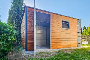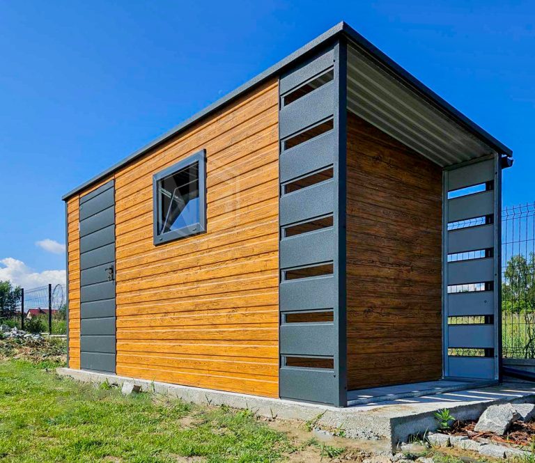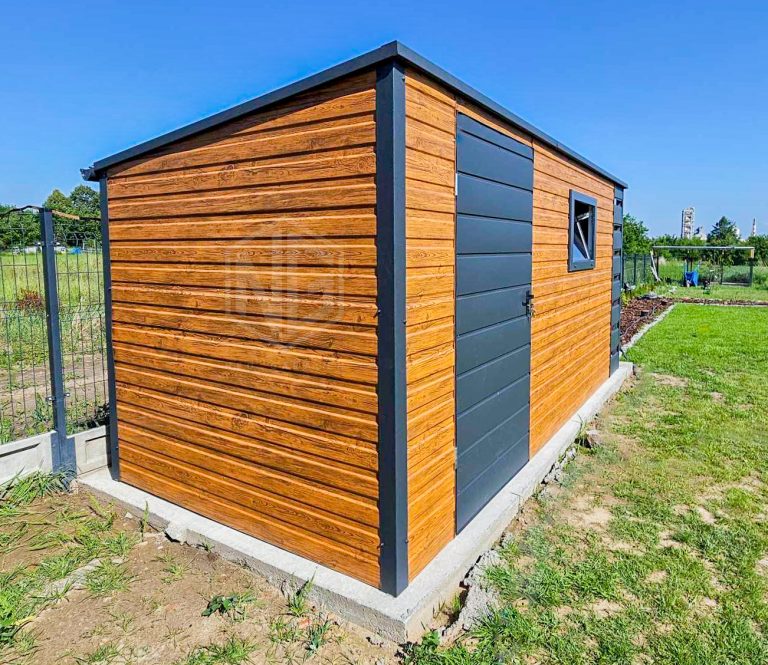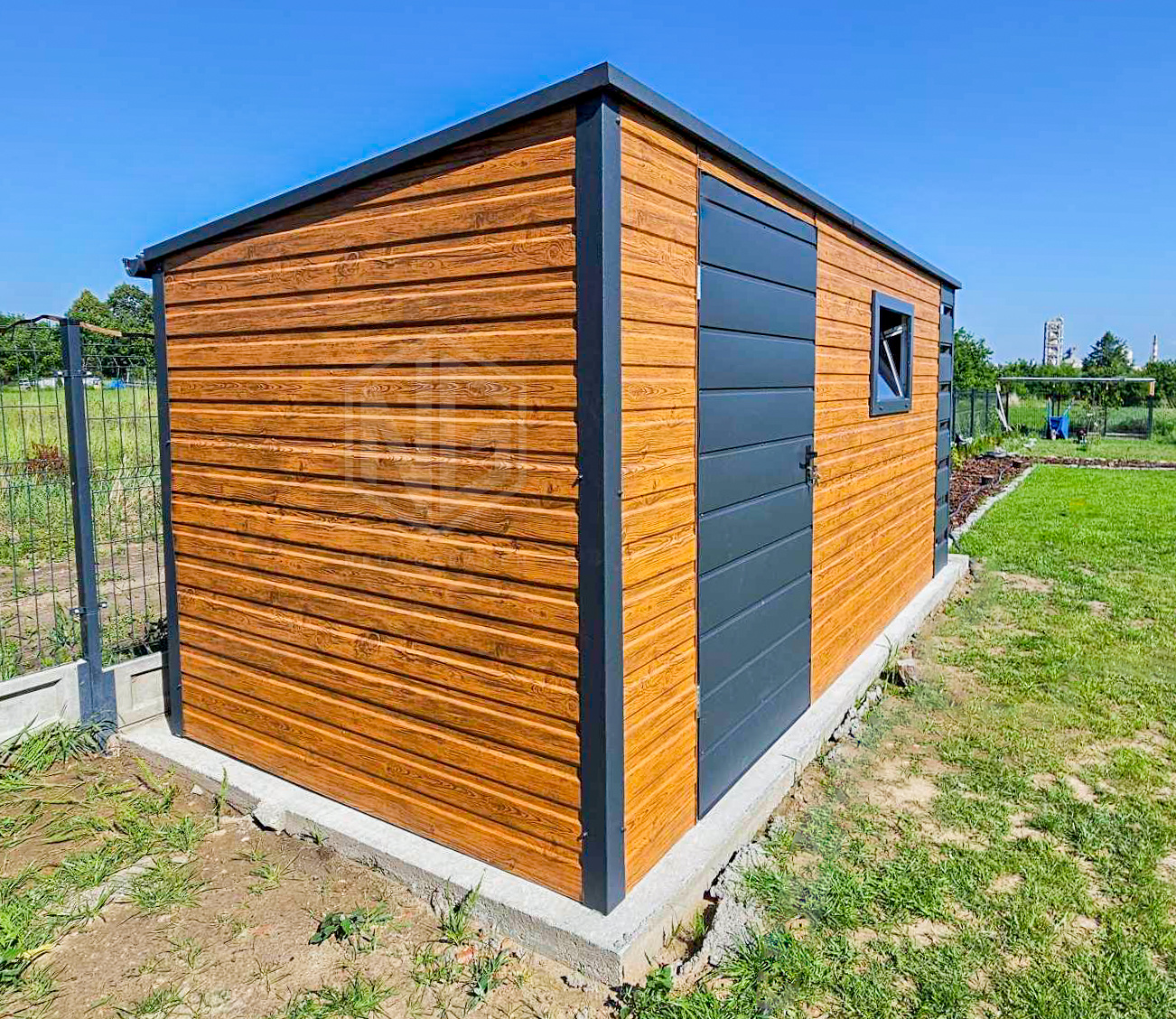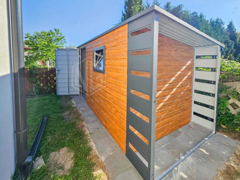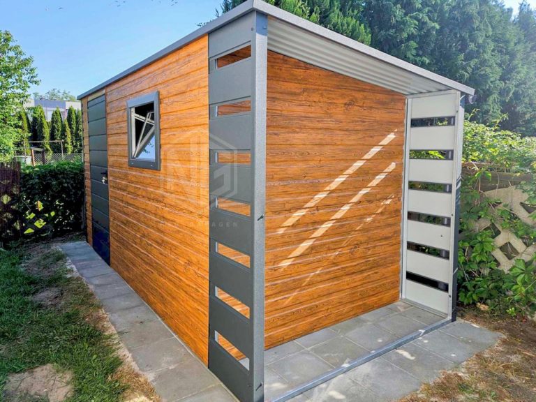 Gartenhaus – Schuppen 4,5x2m + Überdachung 0,5m – Zweiflügeliges Tor – PVC Kippfenster – Helles Walnussholz – Holzoptik – Anthrazit – Flachdach GP383