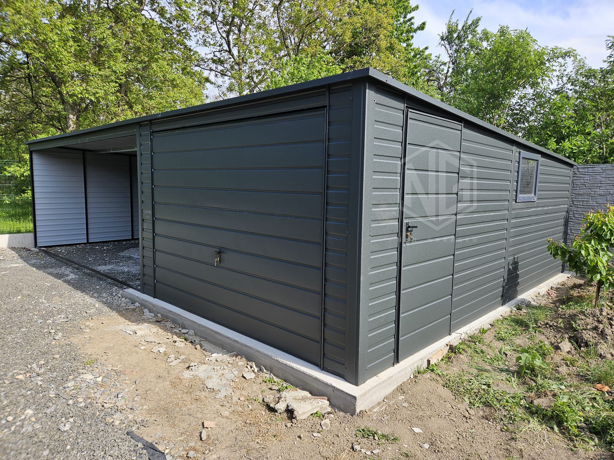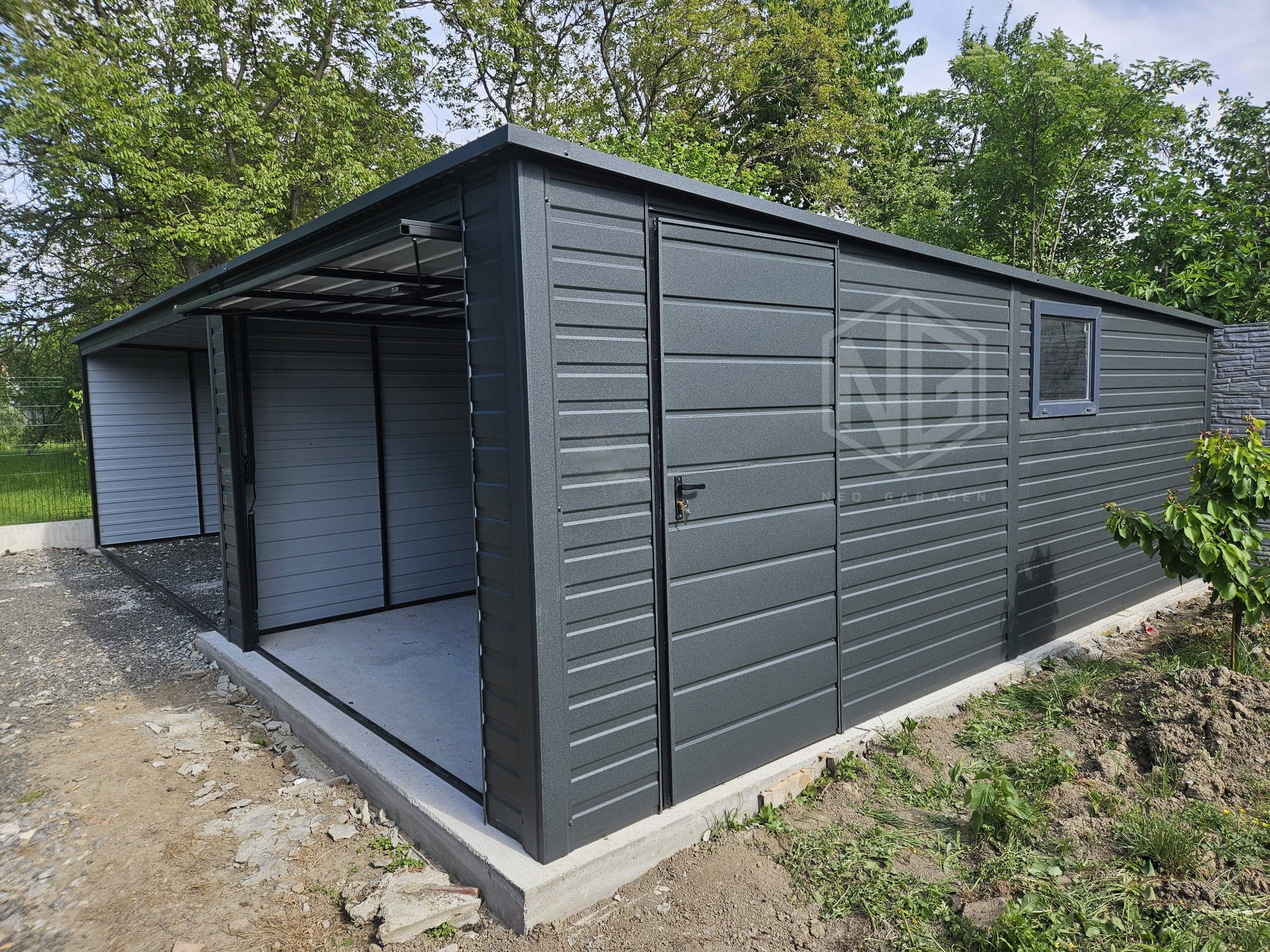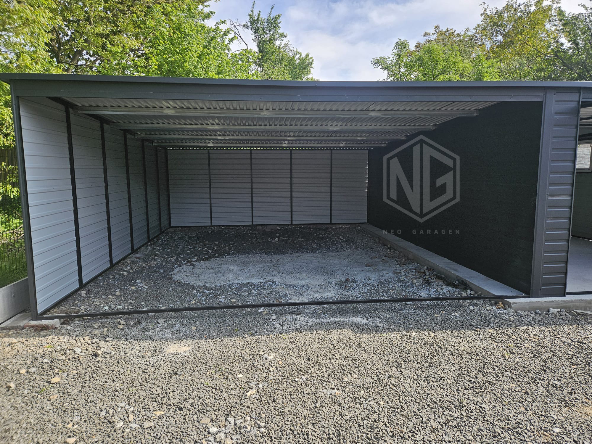 - Überdachung : 5×6 m Die Seiten- und Rückwand sind mit Paneelen verkleidet