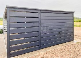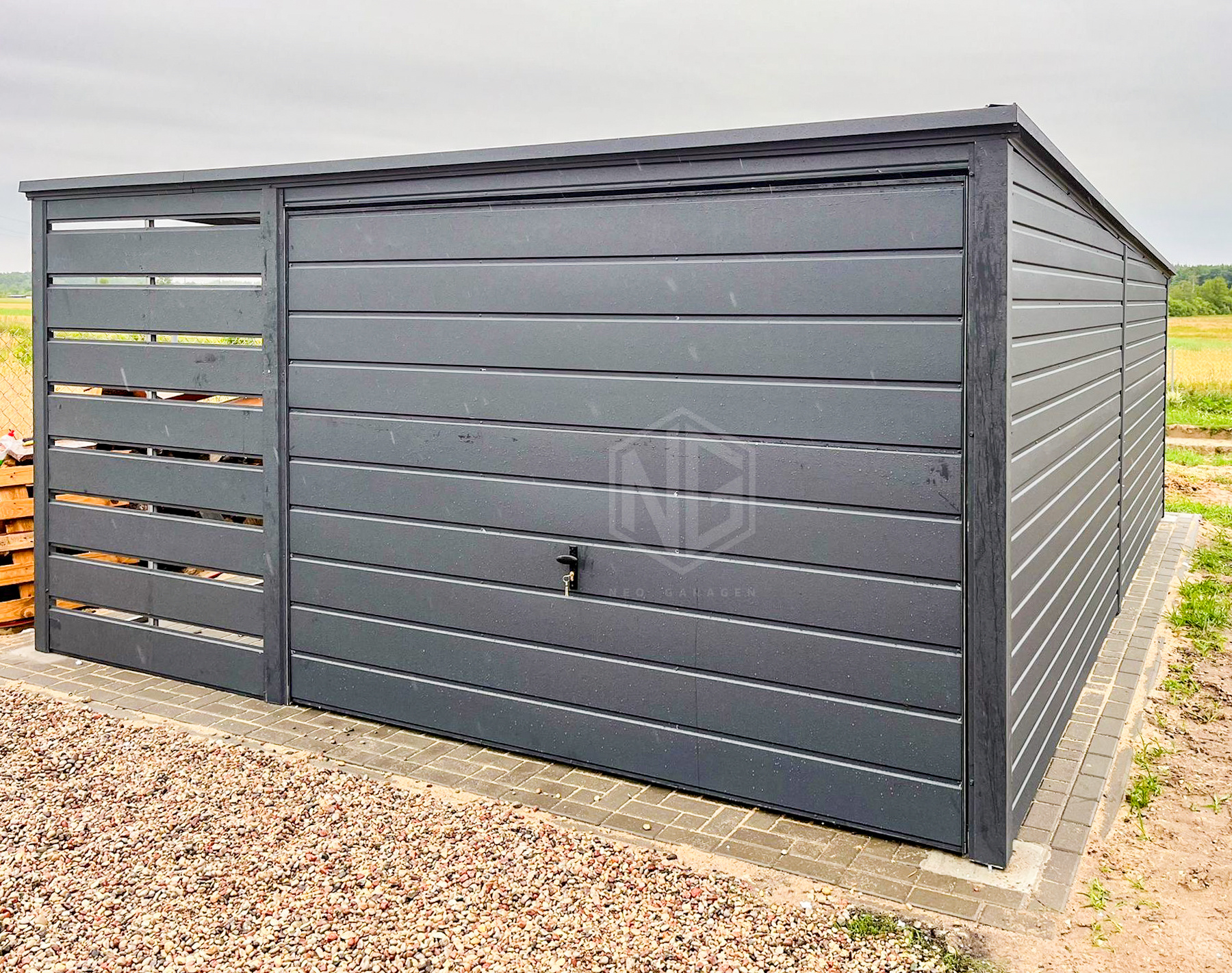 Blechgarage 3x6m + Überdachung 1,2m – Schwingtor – Anthrazit – Flachdach ID674