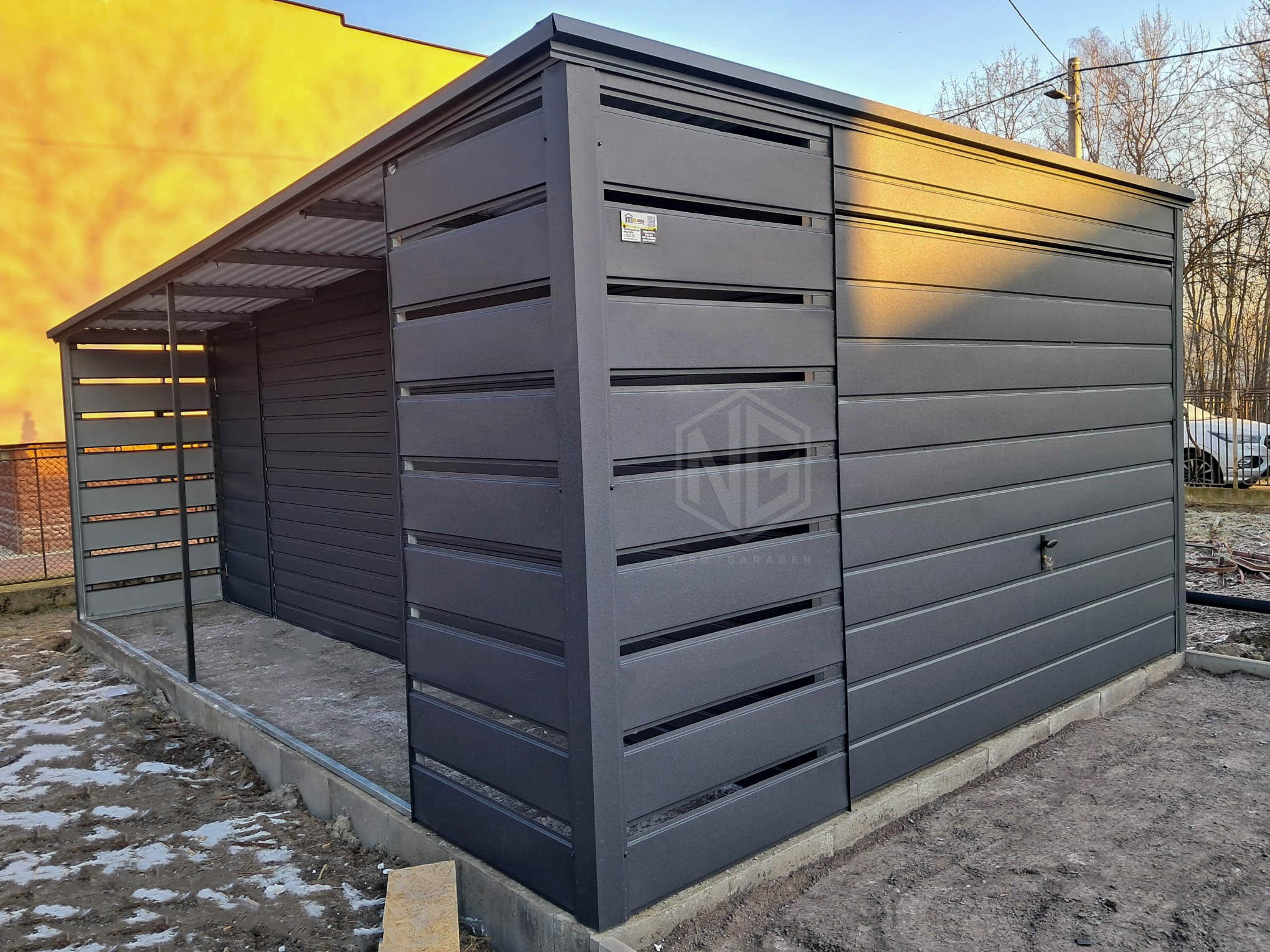 Blechgarage 3x6m + Überdachung 1m – Schwingtor – Tür – Anthrazit – Flachdach ID965