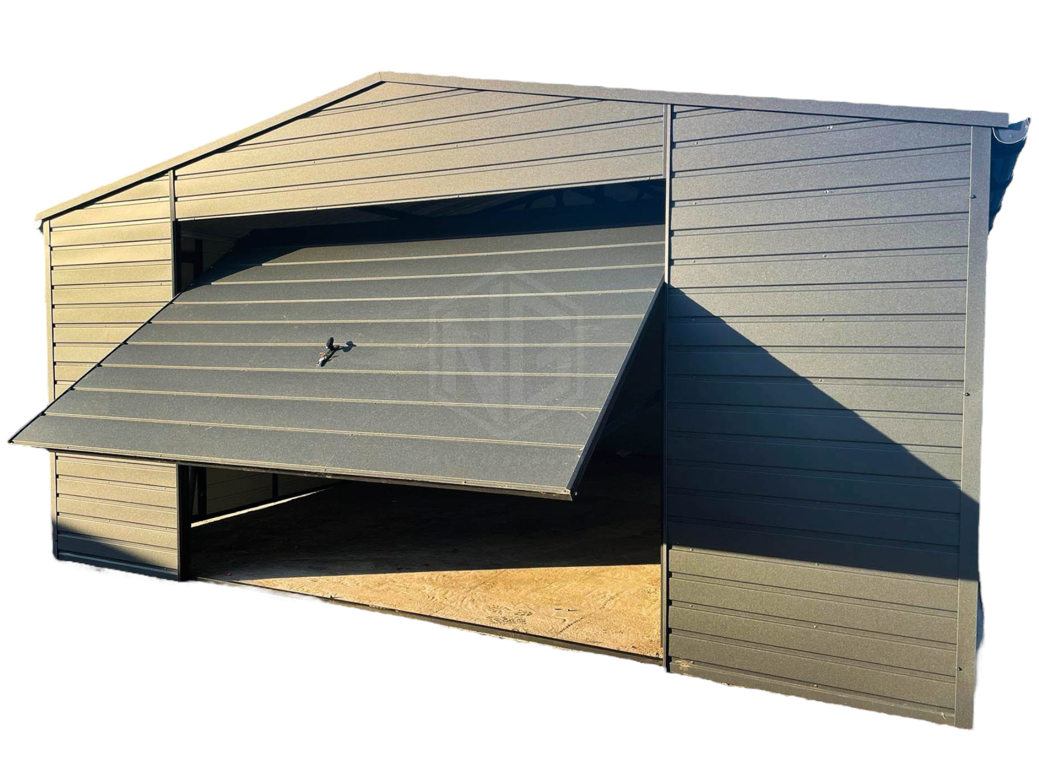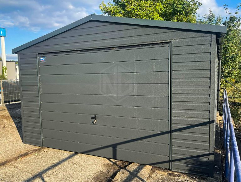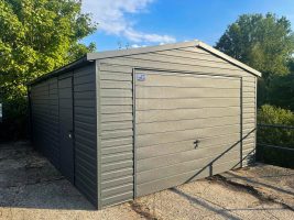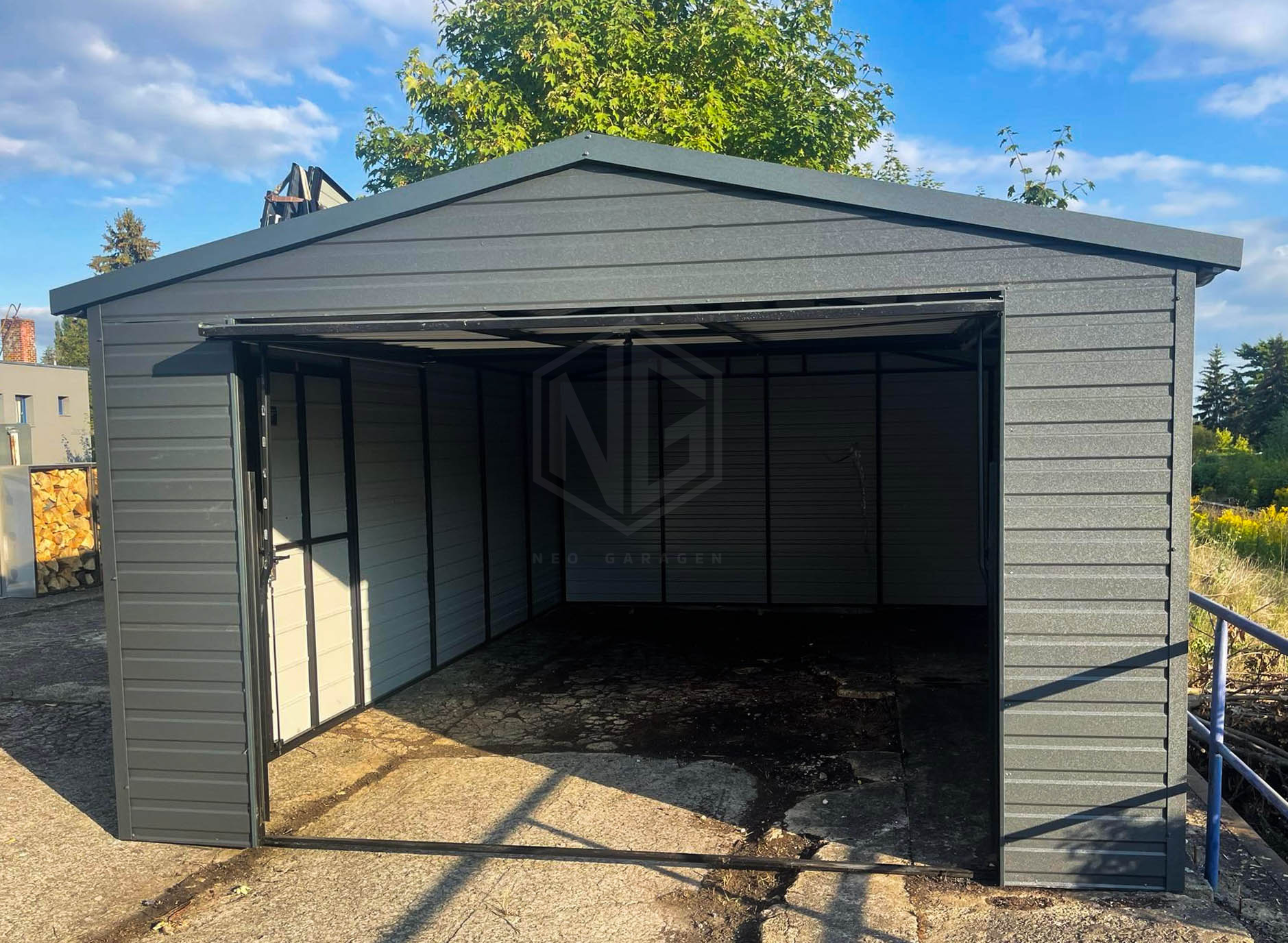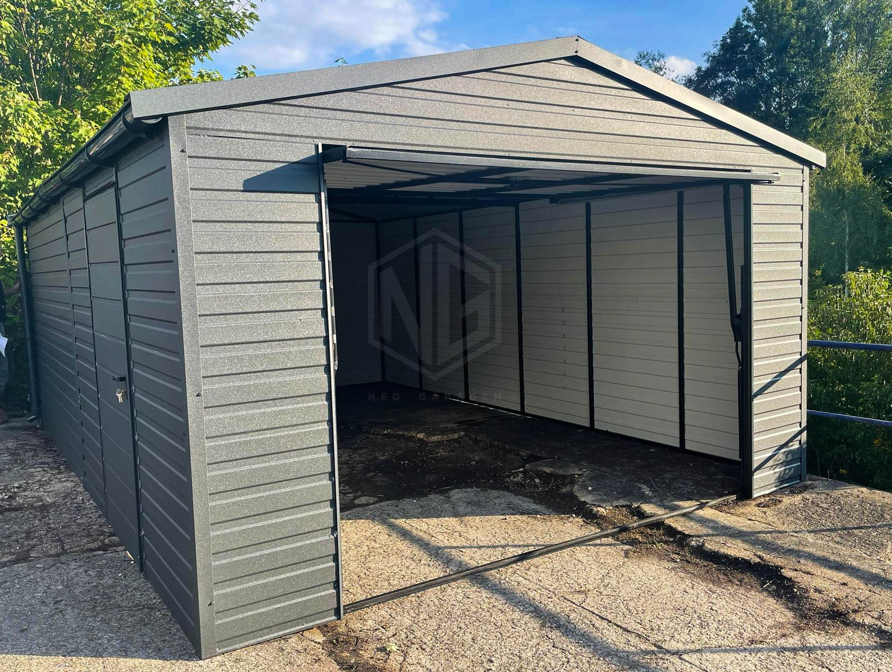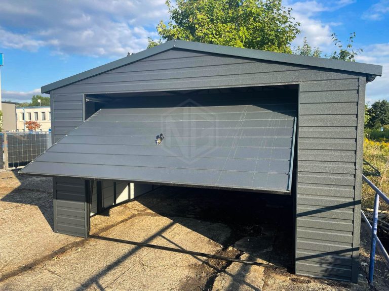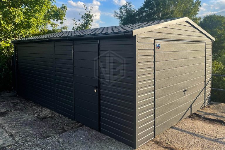 Blechgarage 4,5x6m – Schwingtor + Zusätzliche Tür – Anthrazit – Dachrinnen – Metalldachziegel GP146