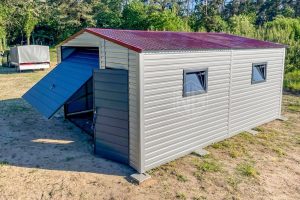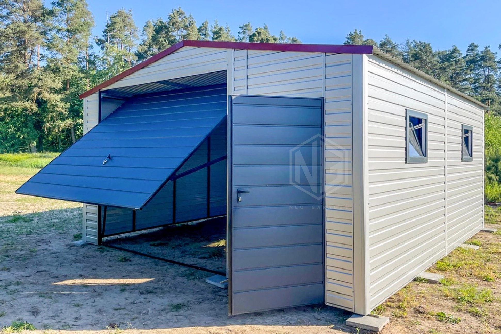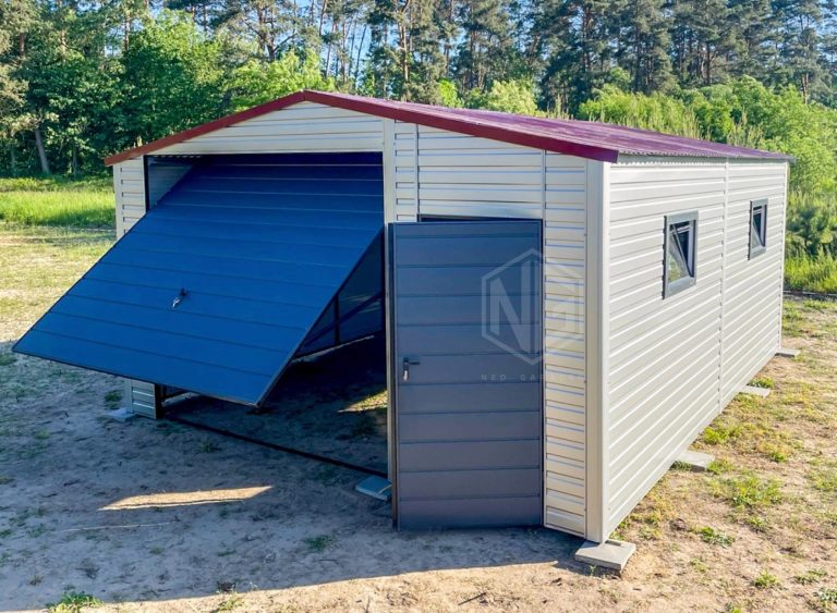 Blechgarage 5x6m – Schwingtor – Tür – 2x PVC Kippfenster – Silber – Kirsche – Anthrazit – Satteldach GP416
