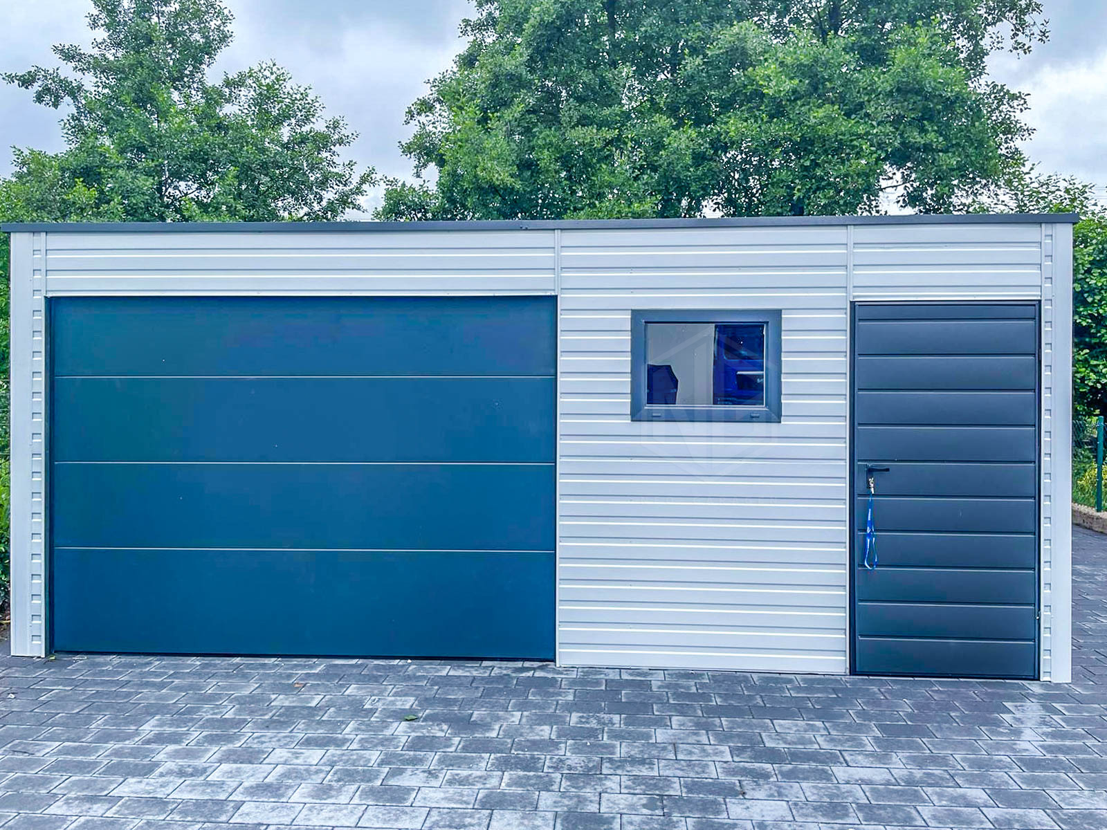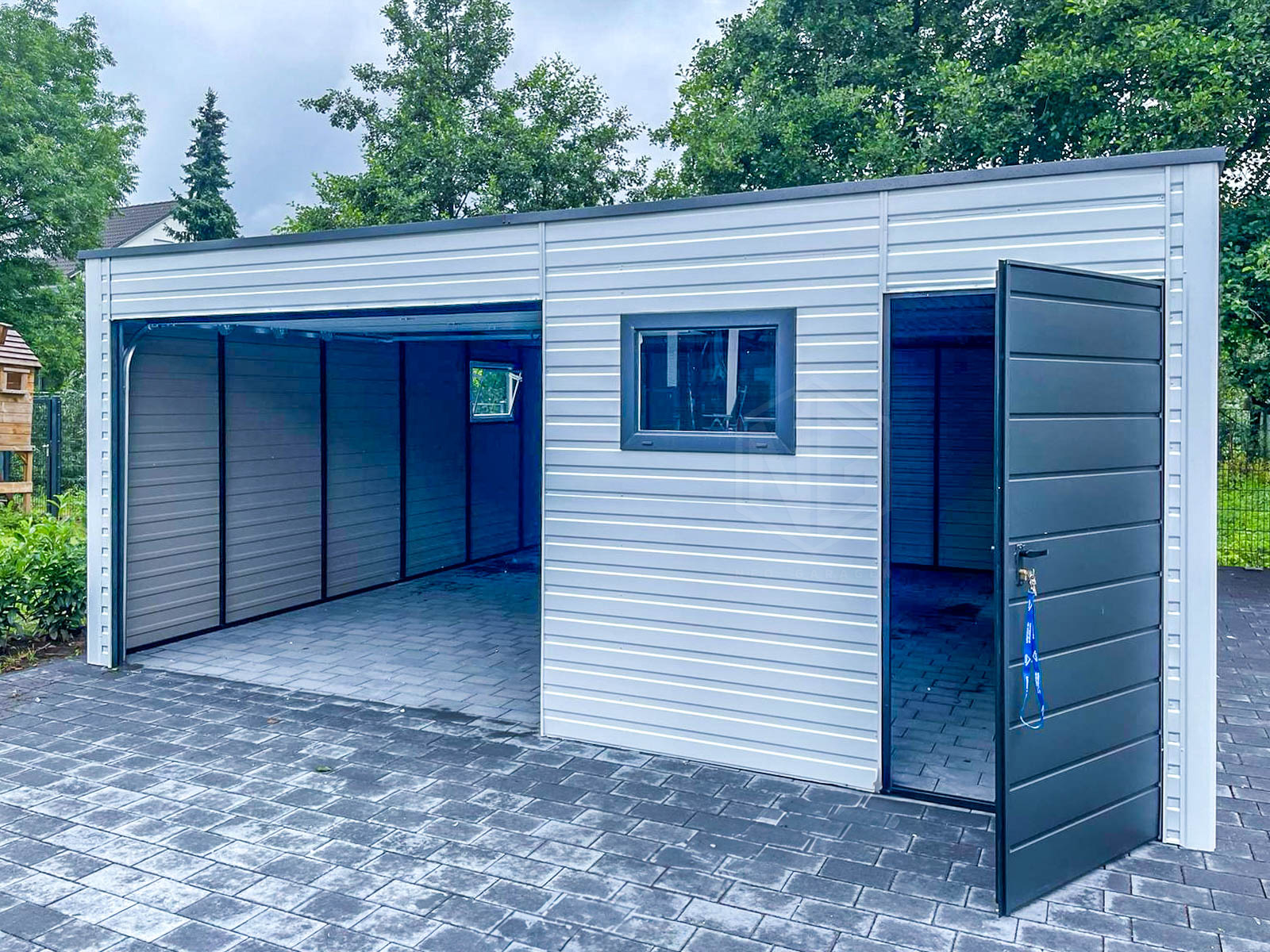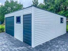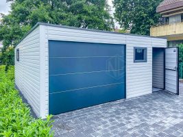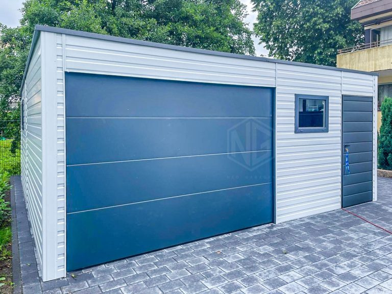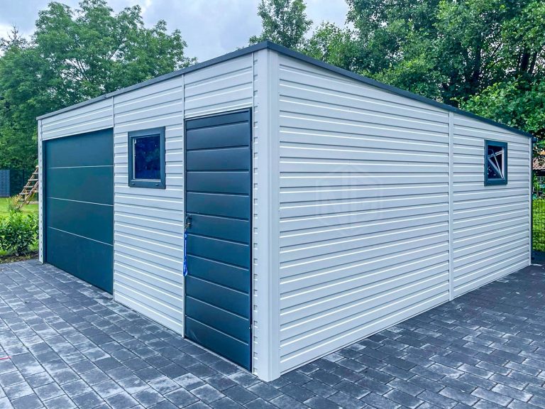 Blechgarage 6,5x6m – Sektionaltor – 3x PVC Kippfenster – Tür – Weiß – Anthrazit – Flachdach GP412