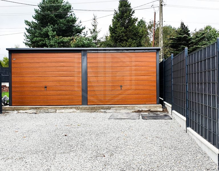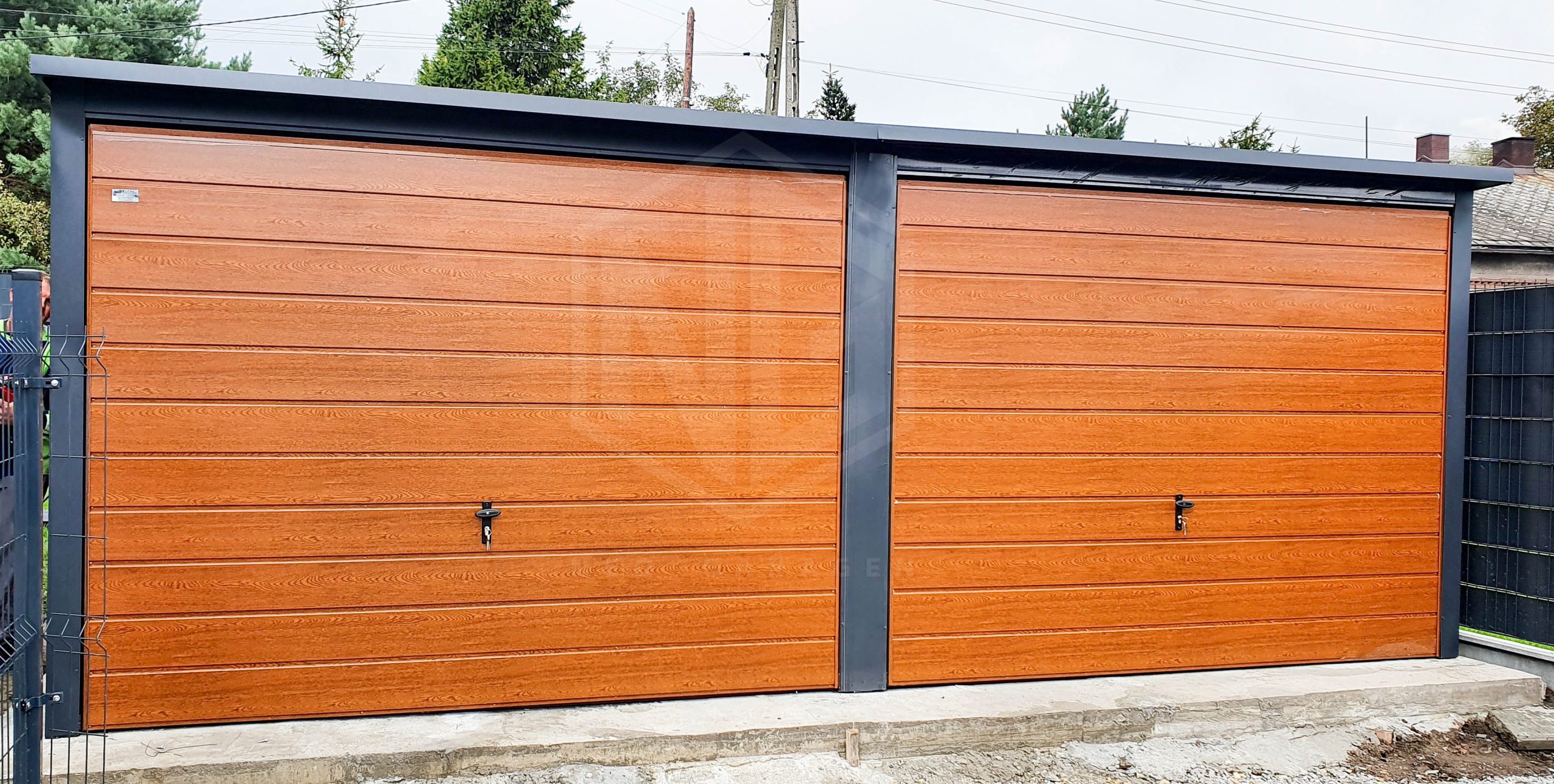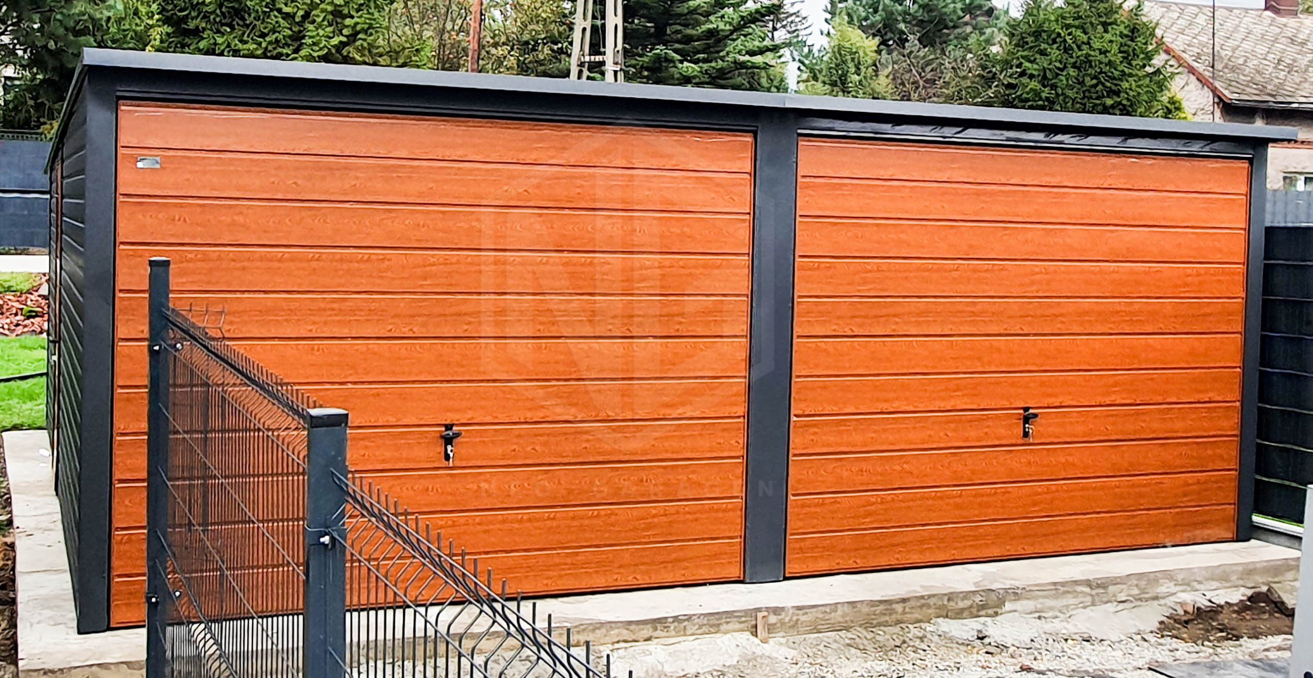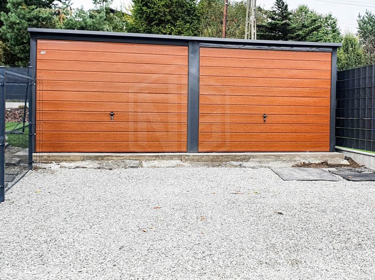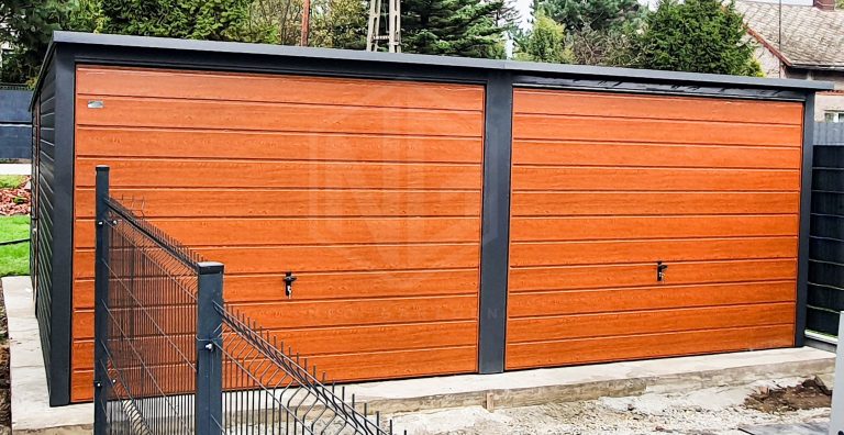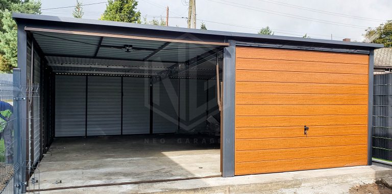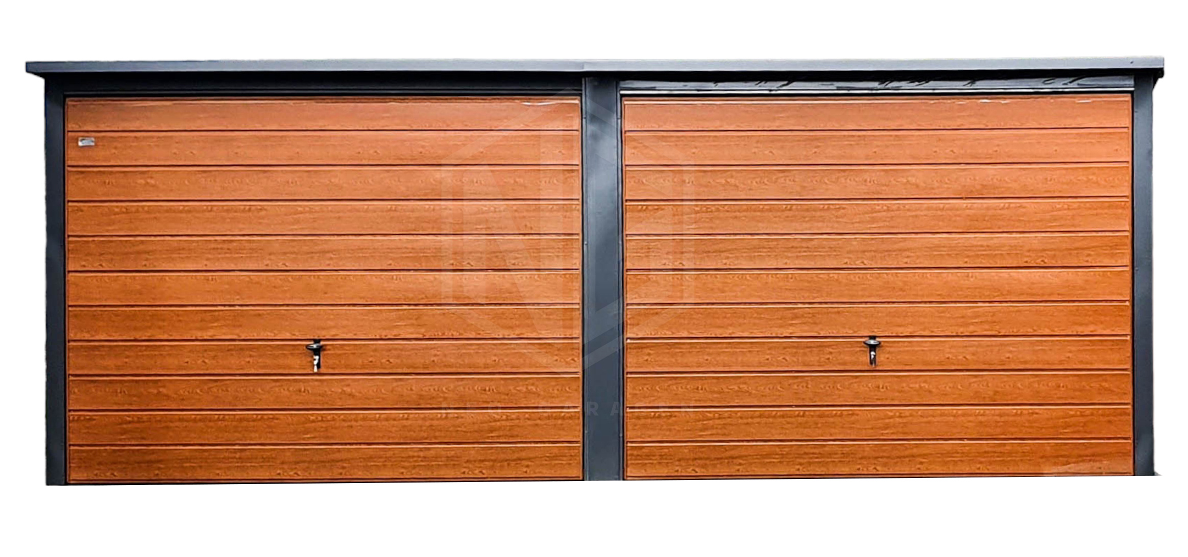Blechgarage 6x6m 2x Schwingtor Überdachung Anthrazit Holzoptik Pultdach ID95