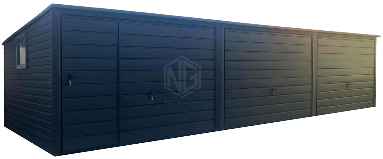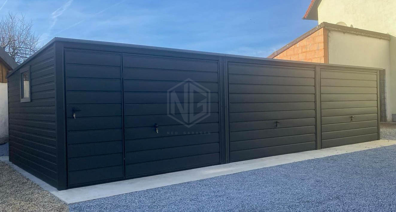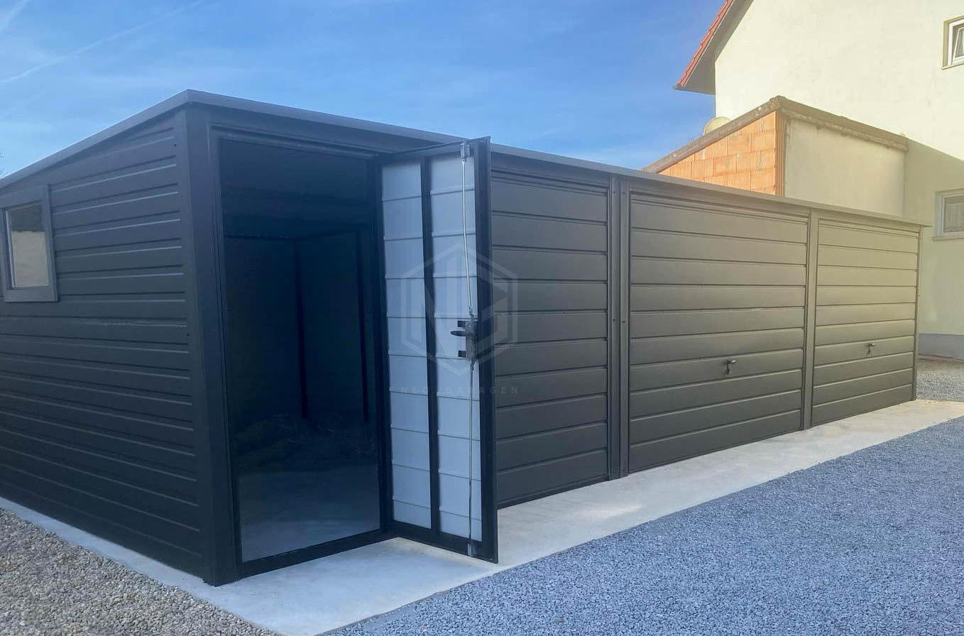 Blechgarage 9×5,5m – 3x Schwingtor – Tür – PVC Kippfenster – Anthrazit – Flachdach | GP600 |