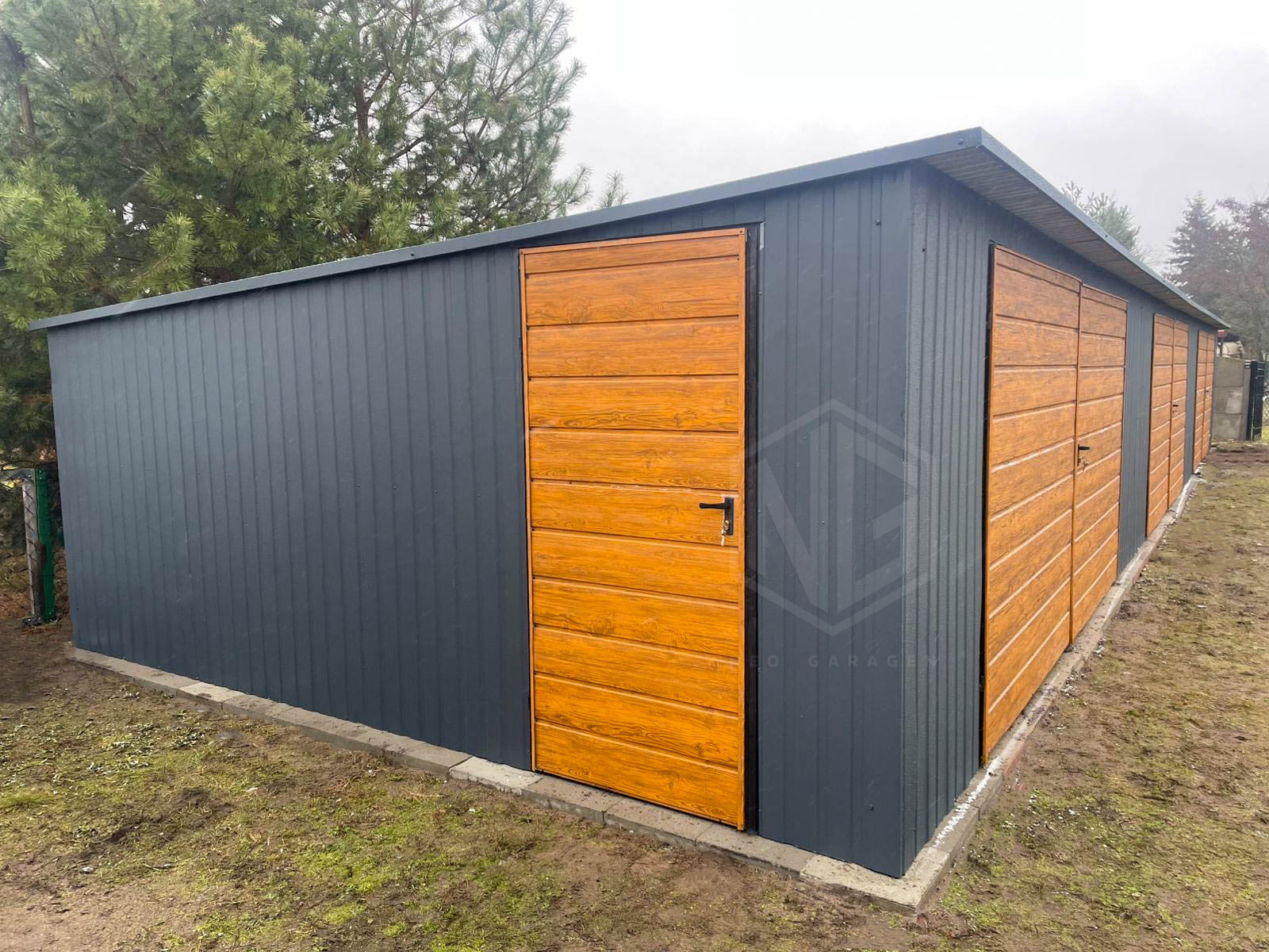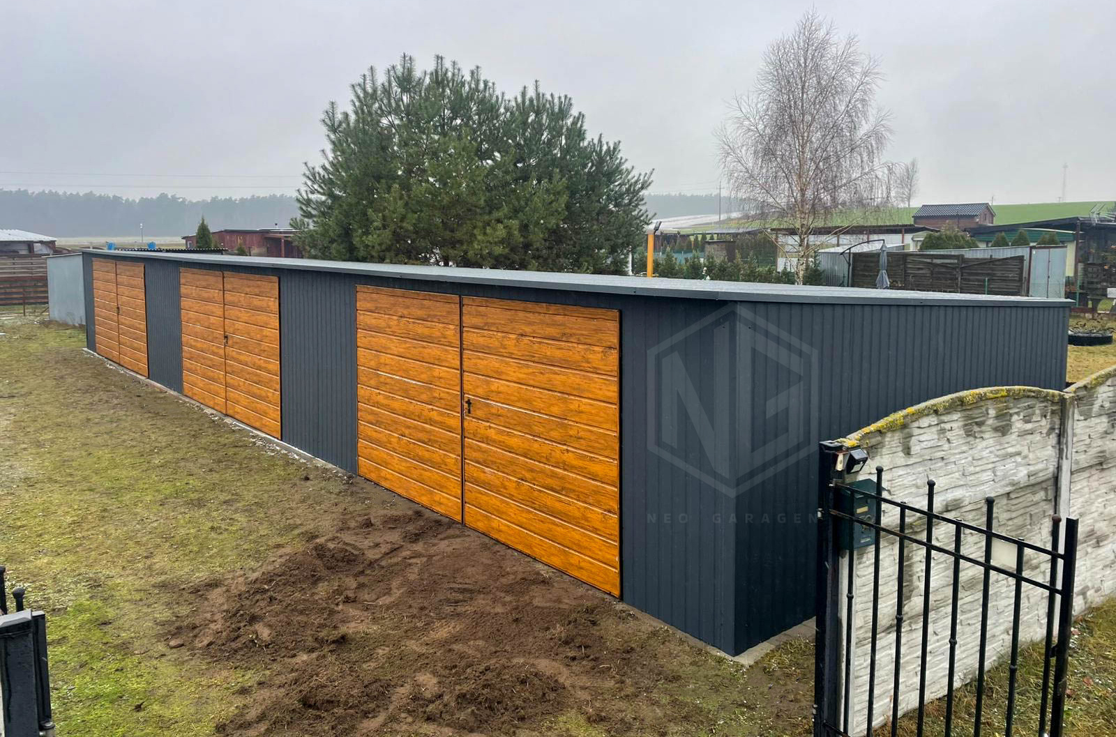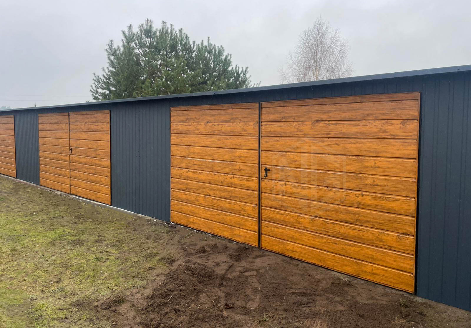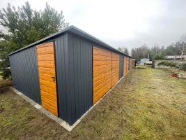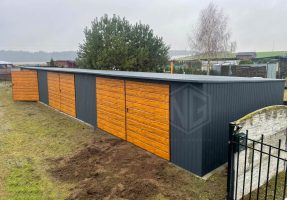 Reihengaragen – Garagenkomplex 18x5m – 3x Zweiflügeliges Tor – Tür – Holzoptik – Anthrazit – Flachdach GP525