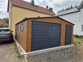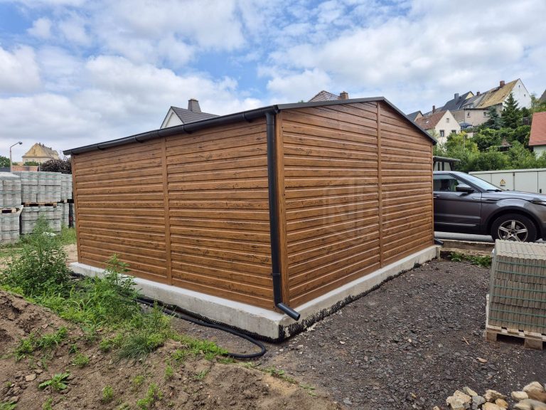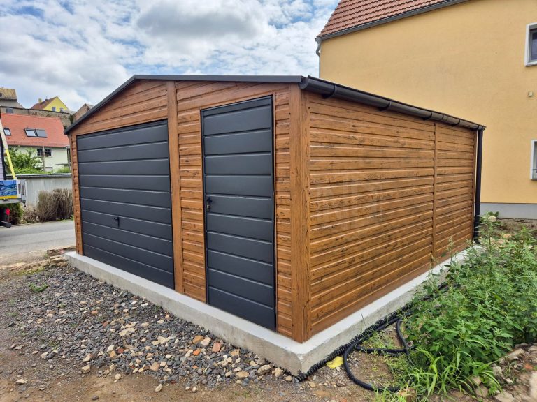 Blechgarage 4,5x5m – Schwingtor – Tür – 2x PVC Kippfenster – Anthrazit – Holzoptik – Dachrinnen – Satteldach | GP632 |