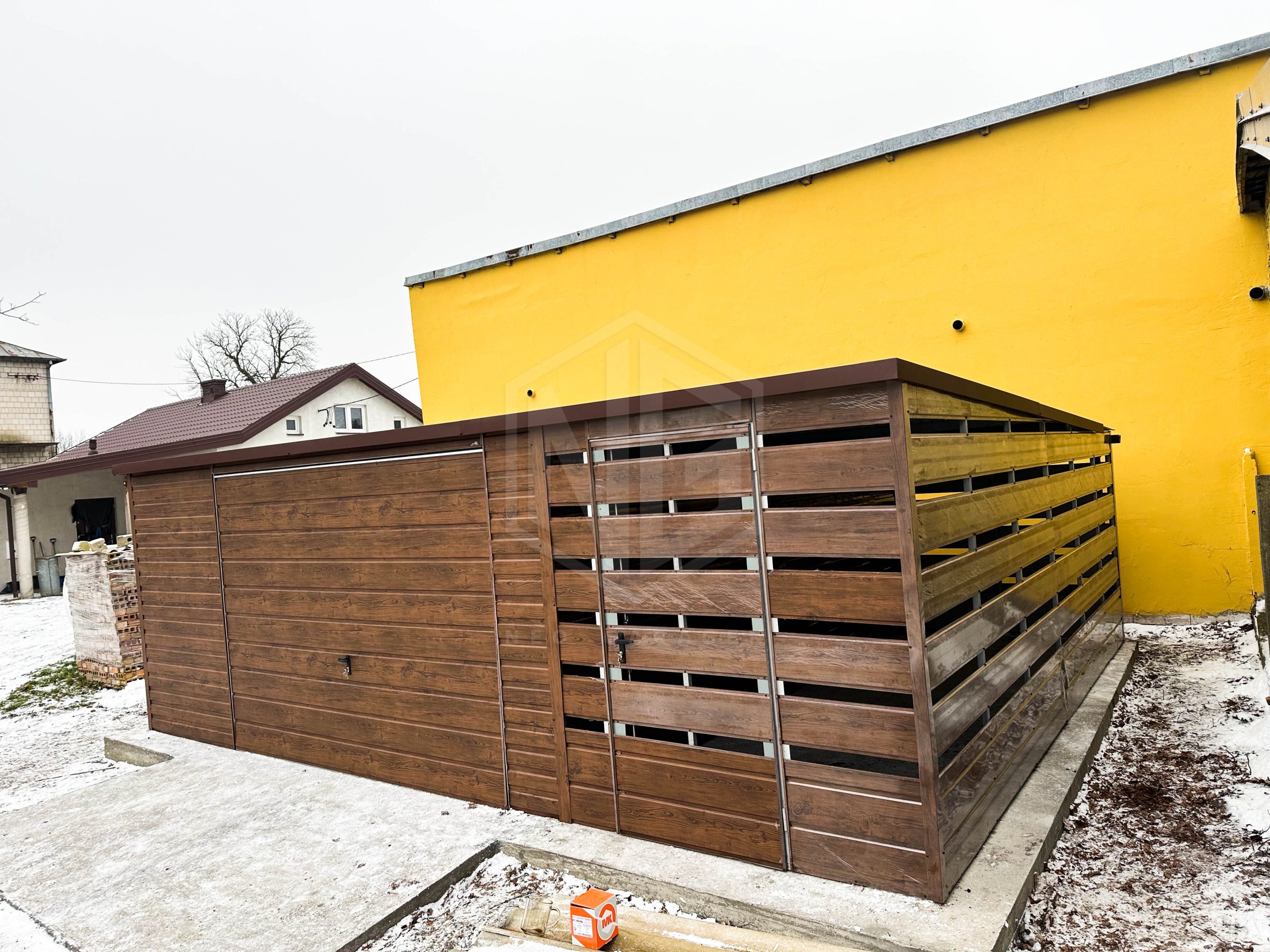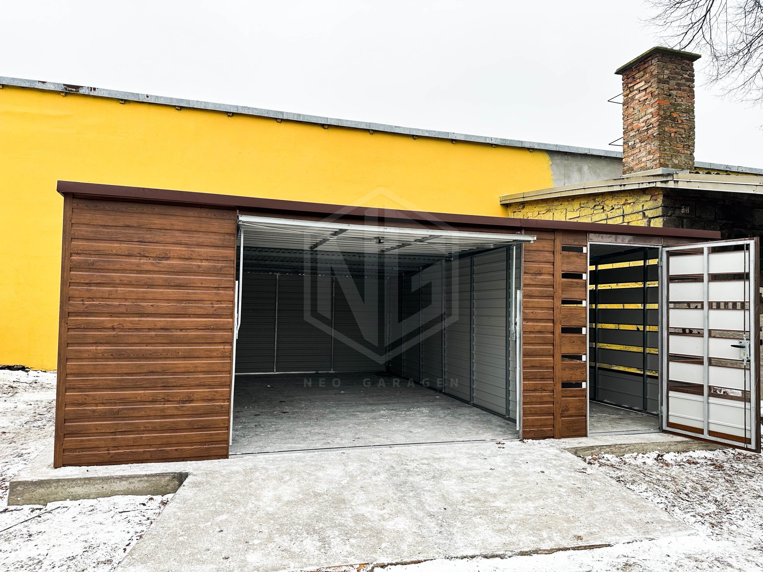 Blechgarage 5x6m Überdachung 2×6 Schwingtor Braun Holzoptik Flachdach ID444