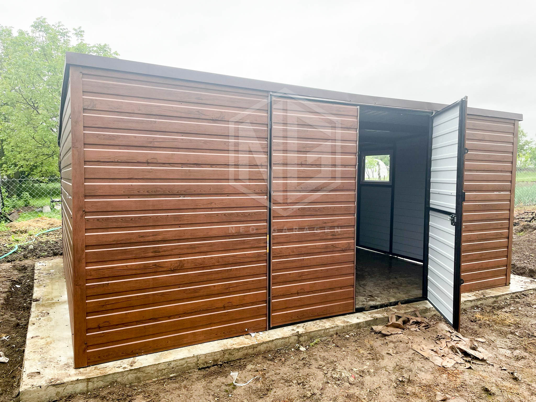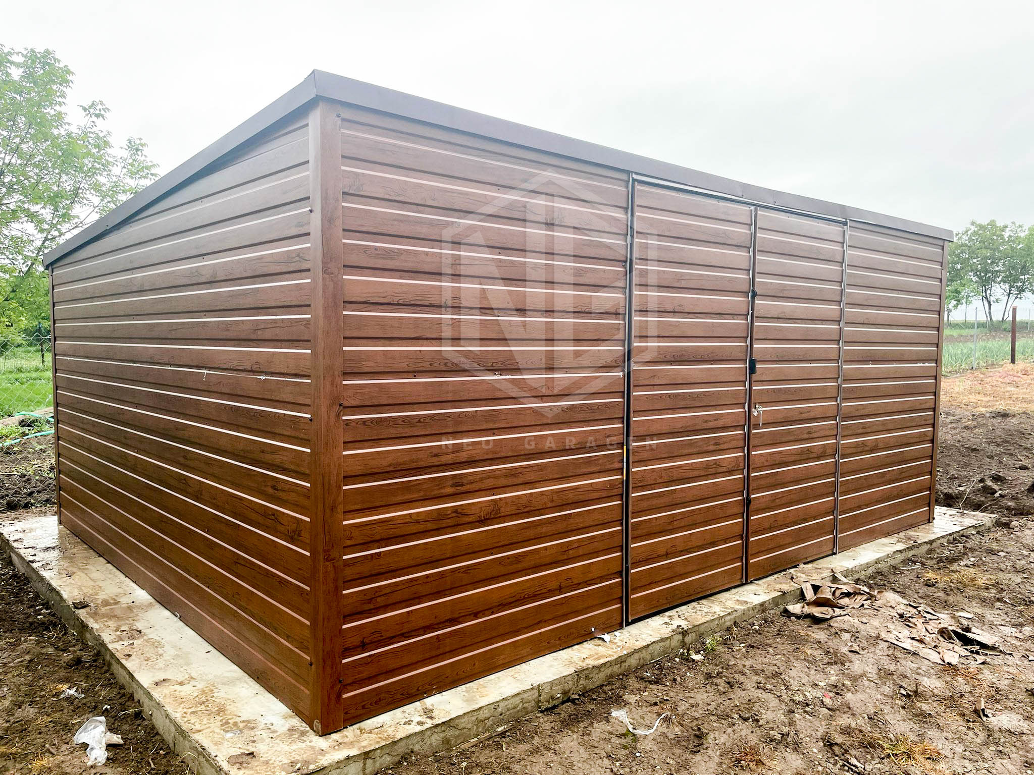 Blechgarage 6x4m – Zweiflügeliges Tor + PVC Kippfenster – Holzoptik – Pultdach GP125