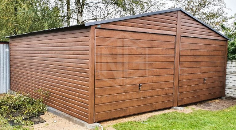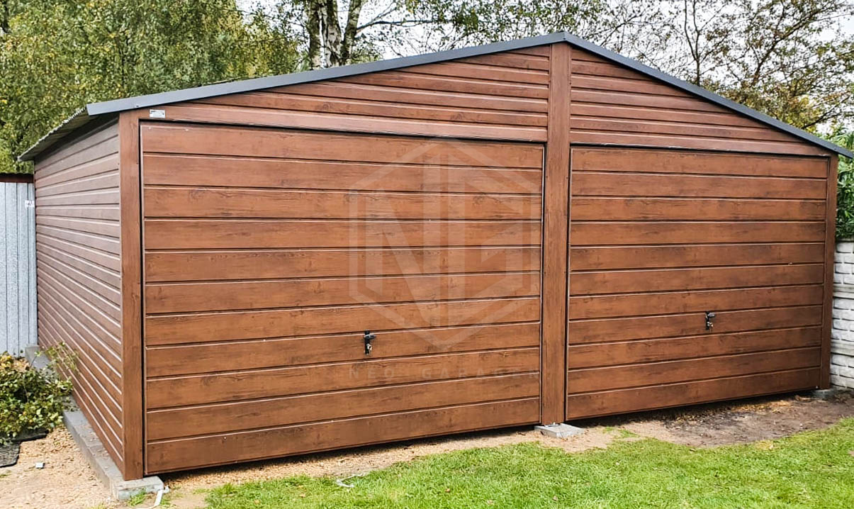Blechgarage 6x5m Horizontal Blech – Holzoptik – 2x Schwingtor – Dunkles Walnussholz ID78