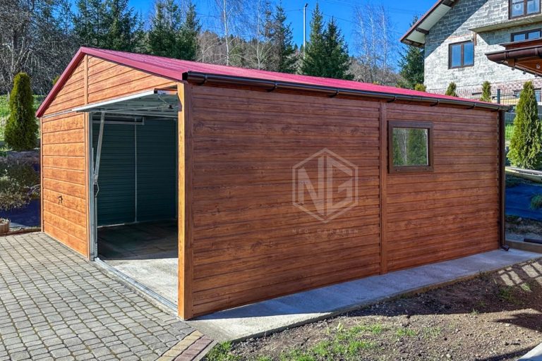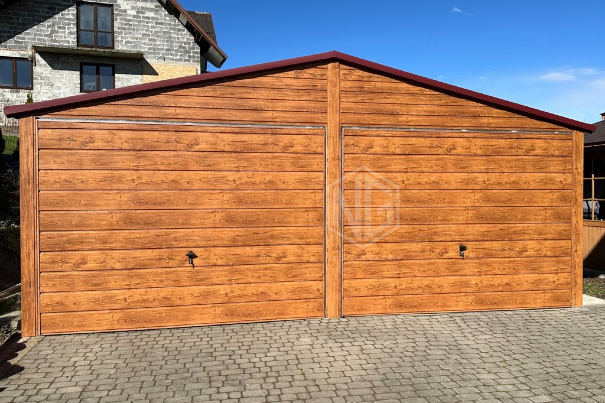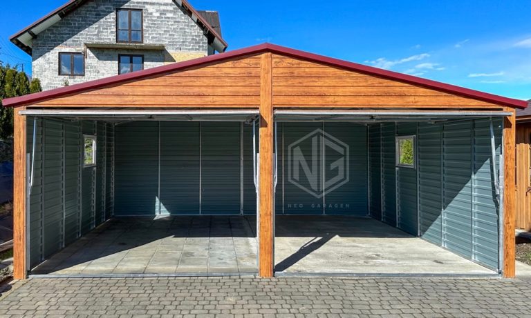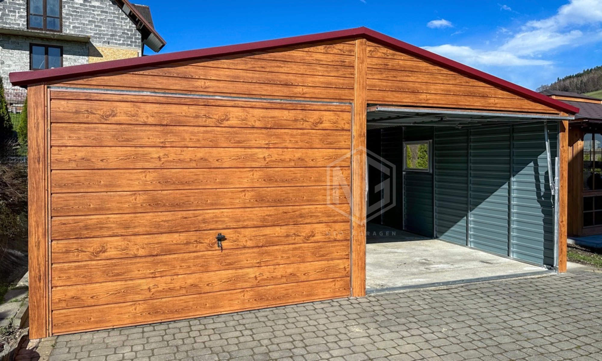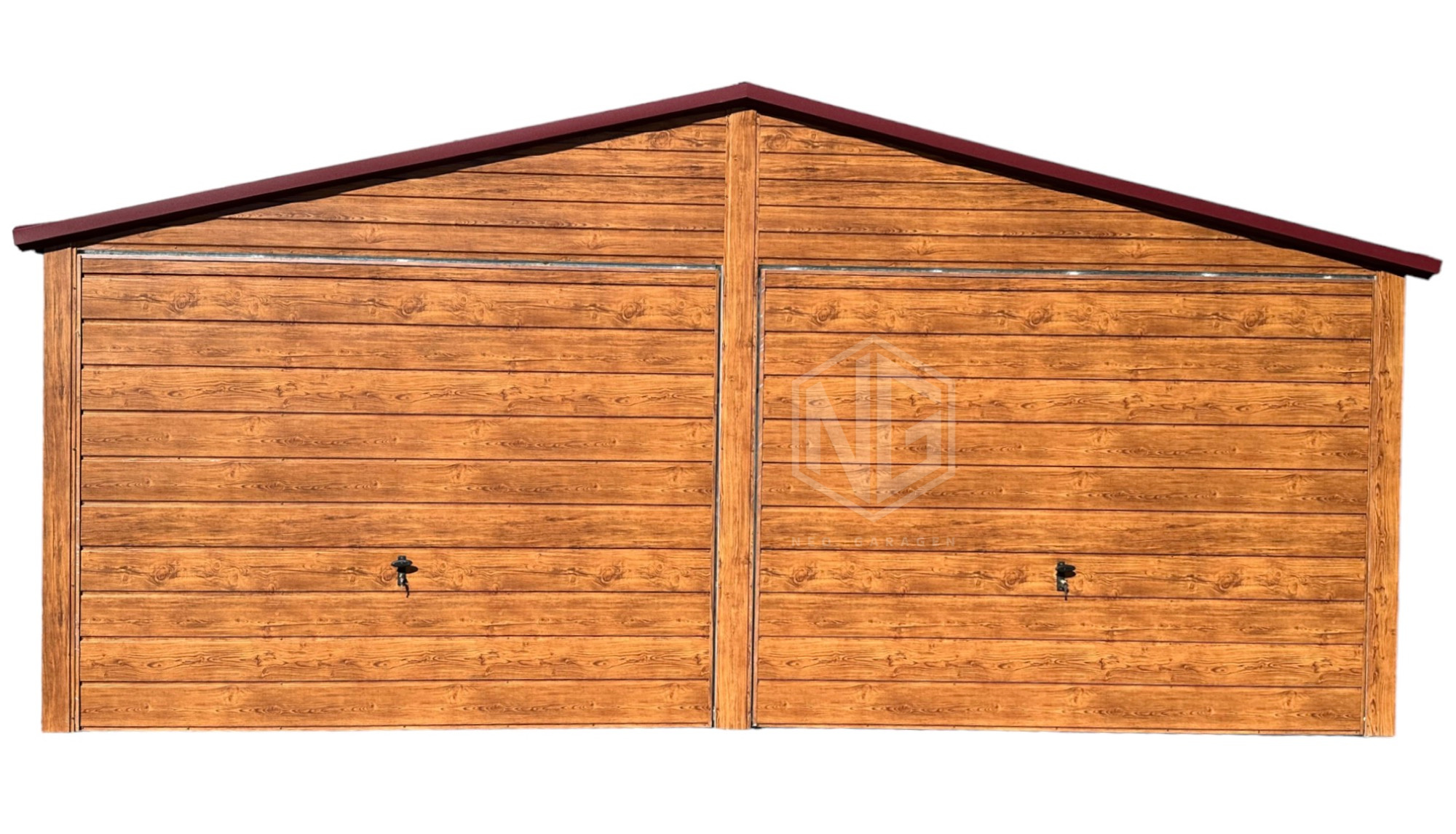 Blechgarage 6x6m -2x Schwingtor – 2x PVC Kippfenster – Helles Walnussholz – verzinkte Konstruktion – Holzoptik – Satteldach ID552