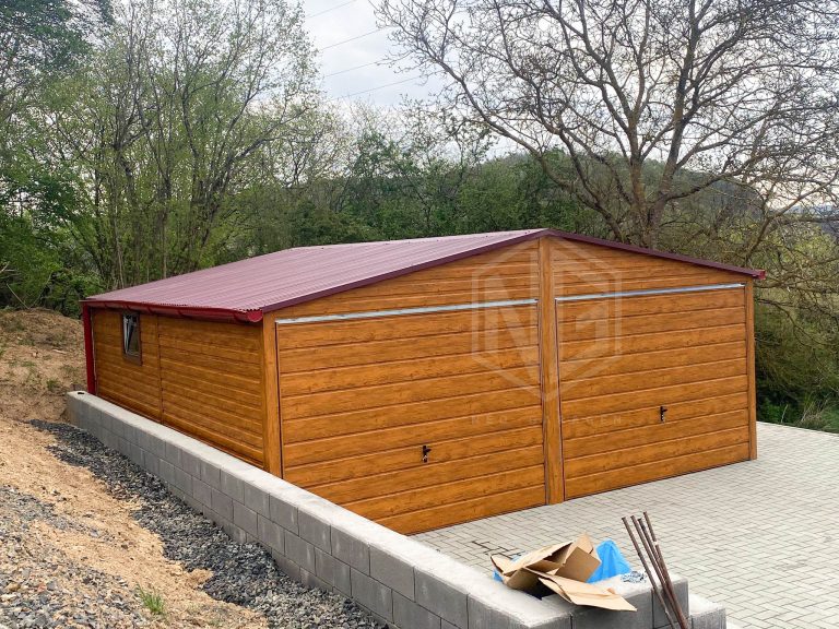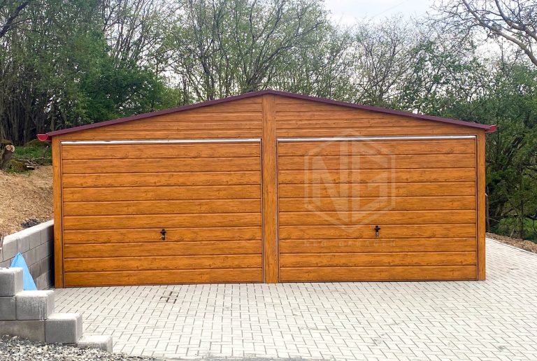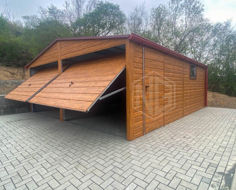 Blechgarage 6x6m – 2x Schwingtor – Tür – Holzoptik – Dachrinnen – Satteldach | GP633 |