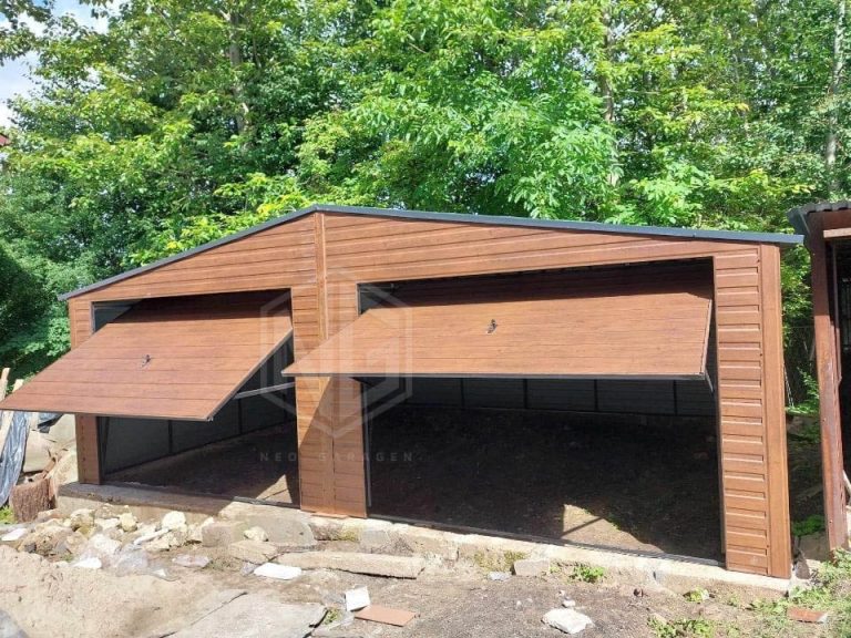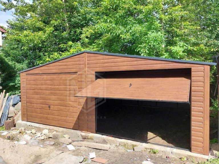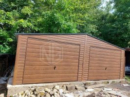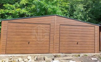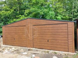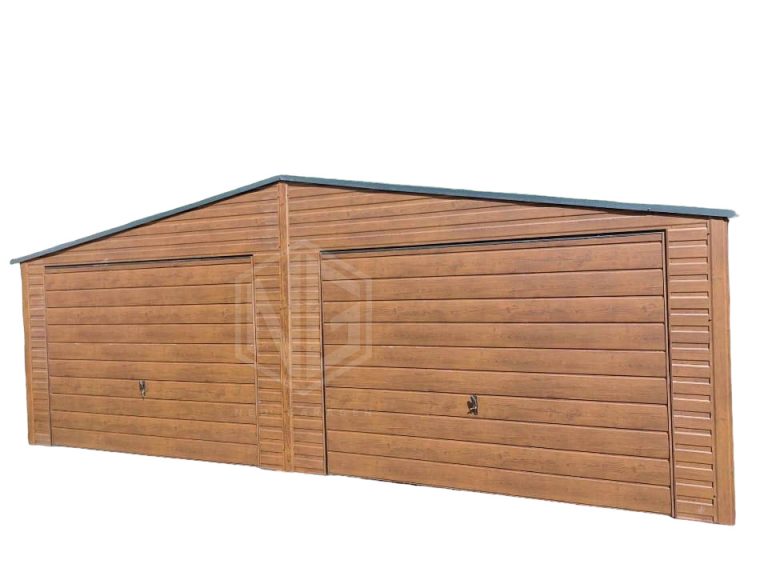 Blechgarage 7x5m-2x Schwingtor-HolzOptik-Helles Walnussholz-Satteldach GP203