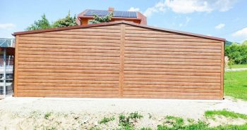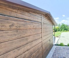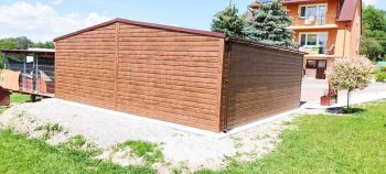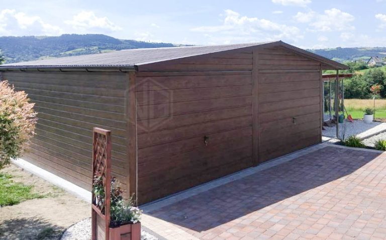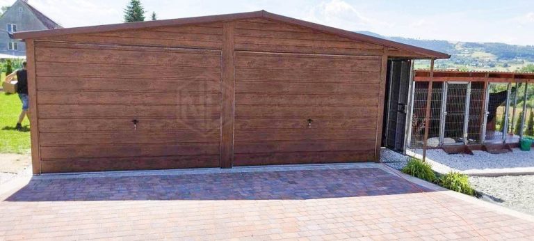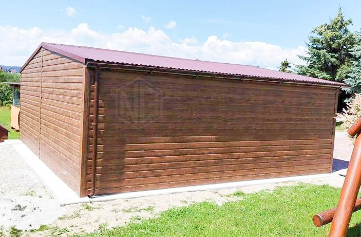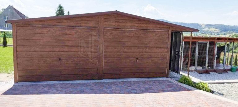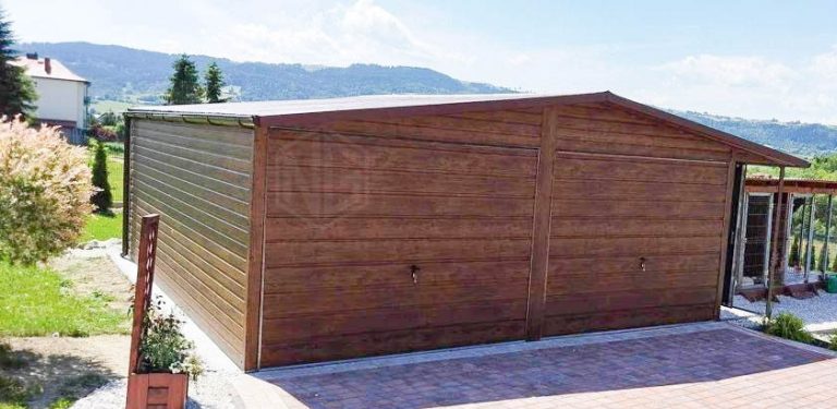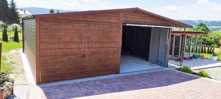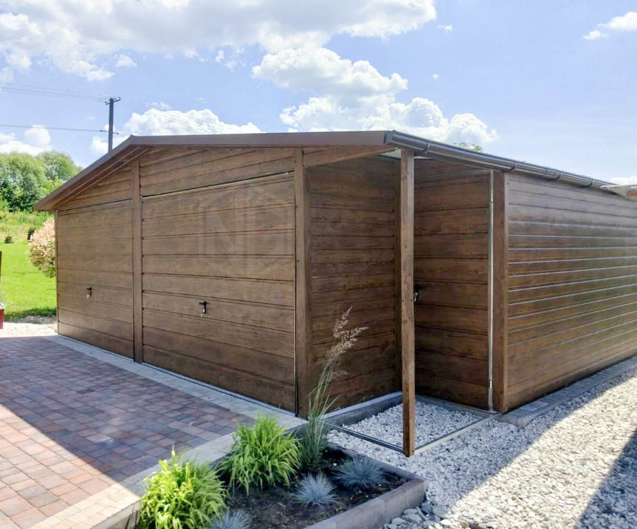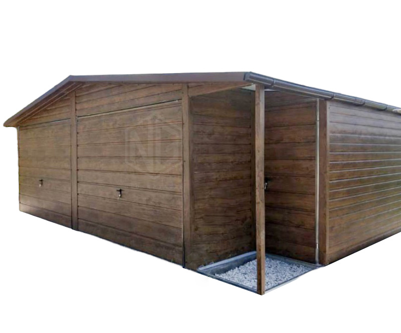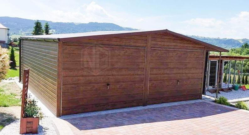 Blechgarage 7x7m Wandnische in der Garage 2x Schwingtor Dachrinnen Holzoptik ID278