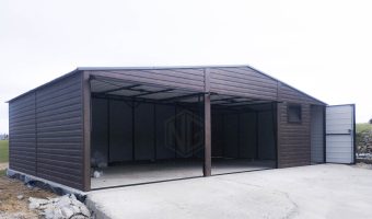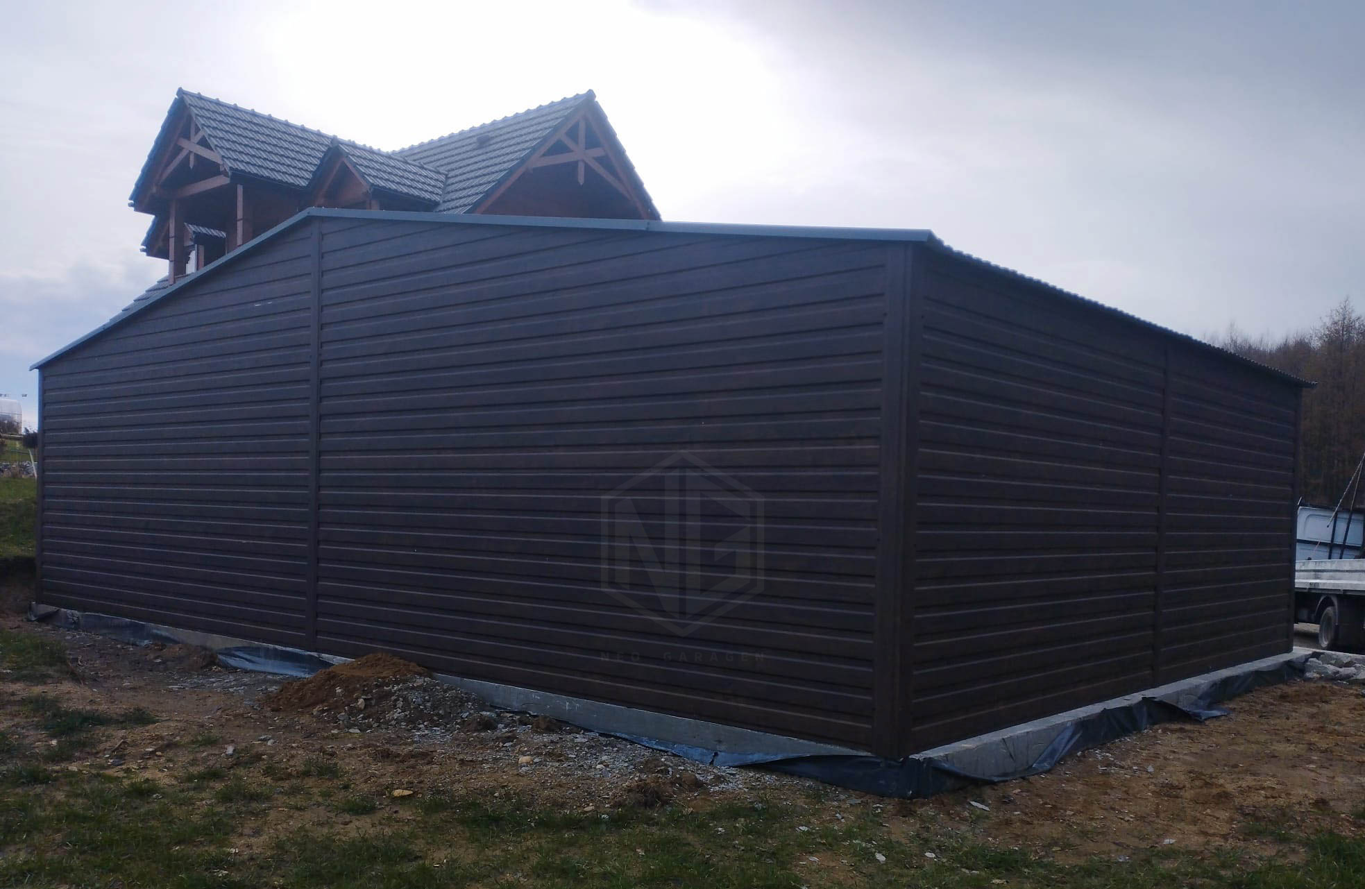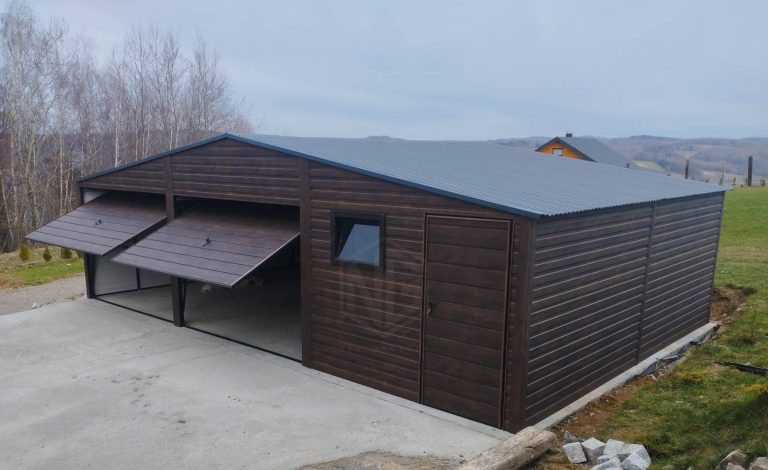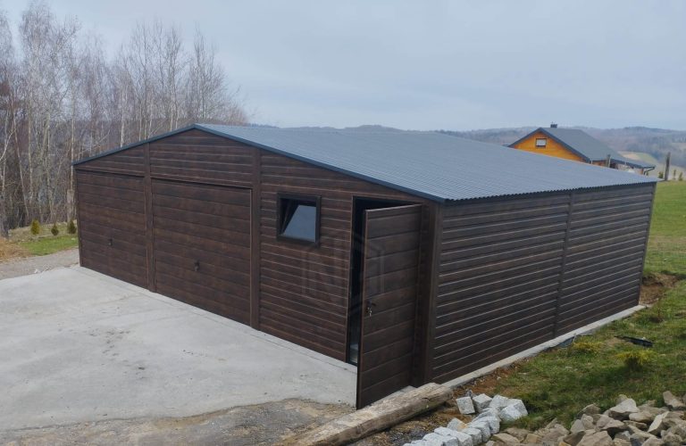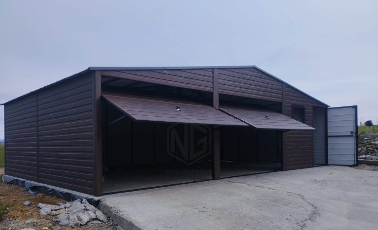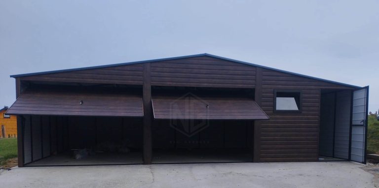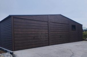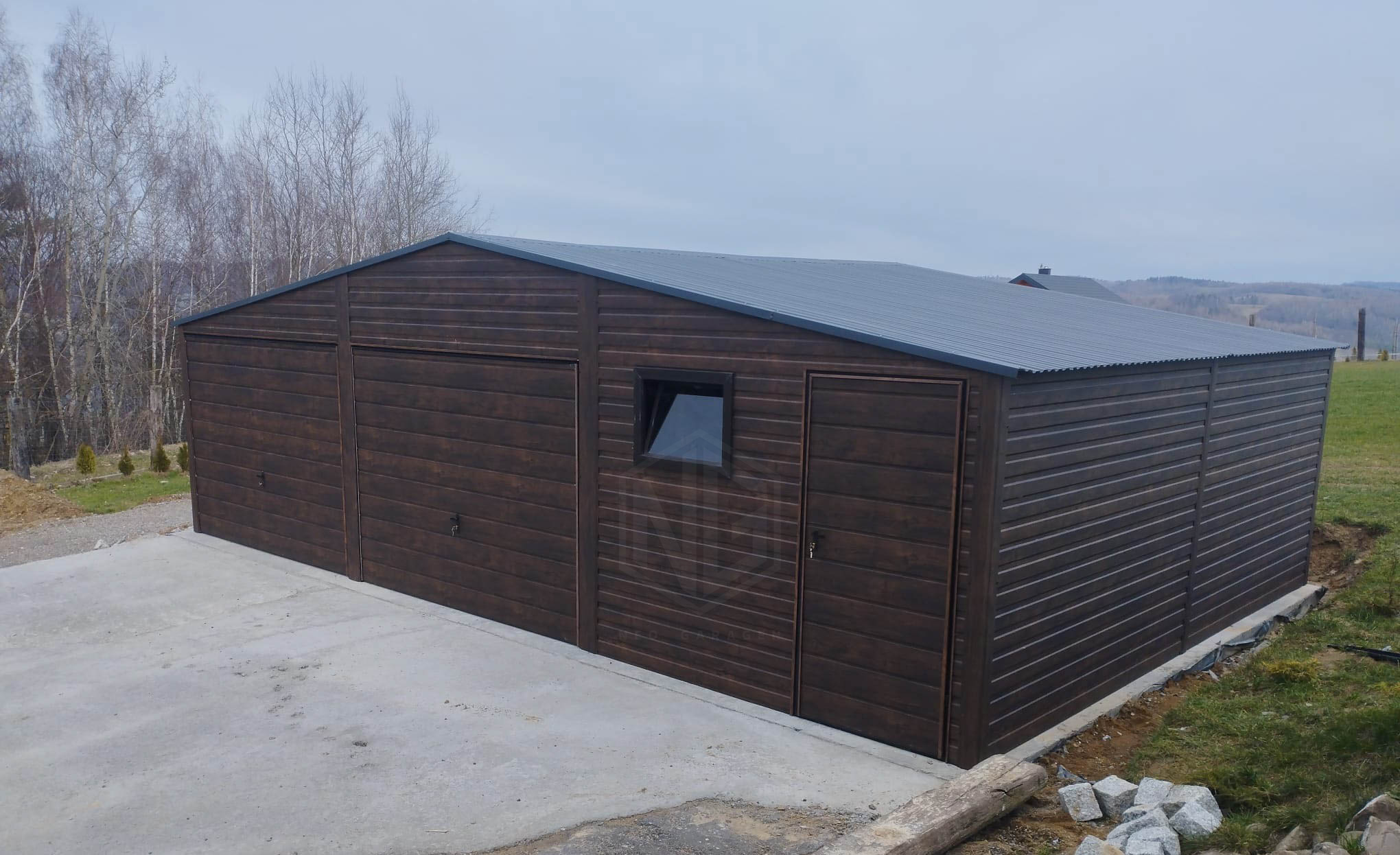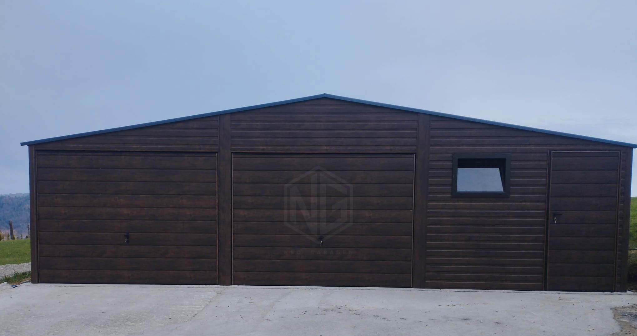 Blechgarage 9x6m – 2x Schwingtor – Tür – PVC Kippfenster – Dunkles Walnussholz – Anthrazit – Satteldach GP280