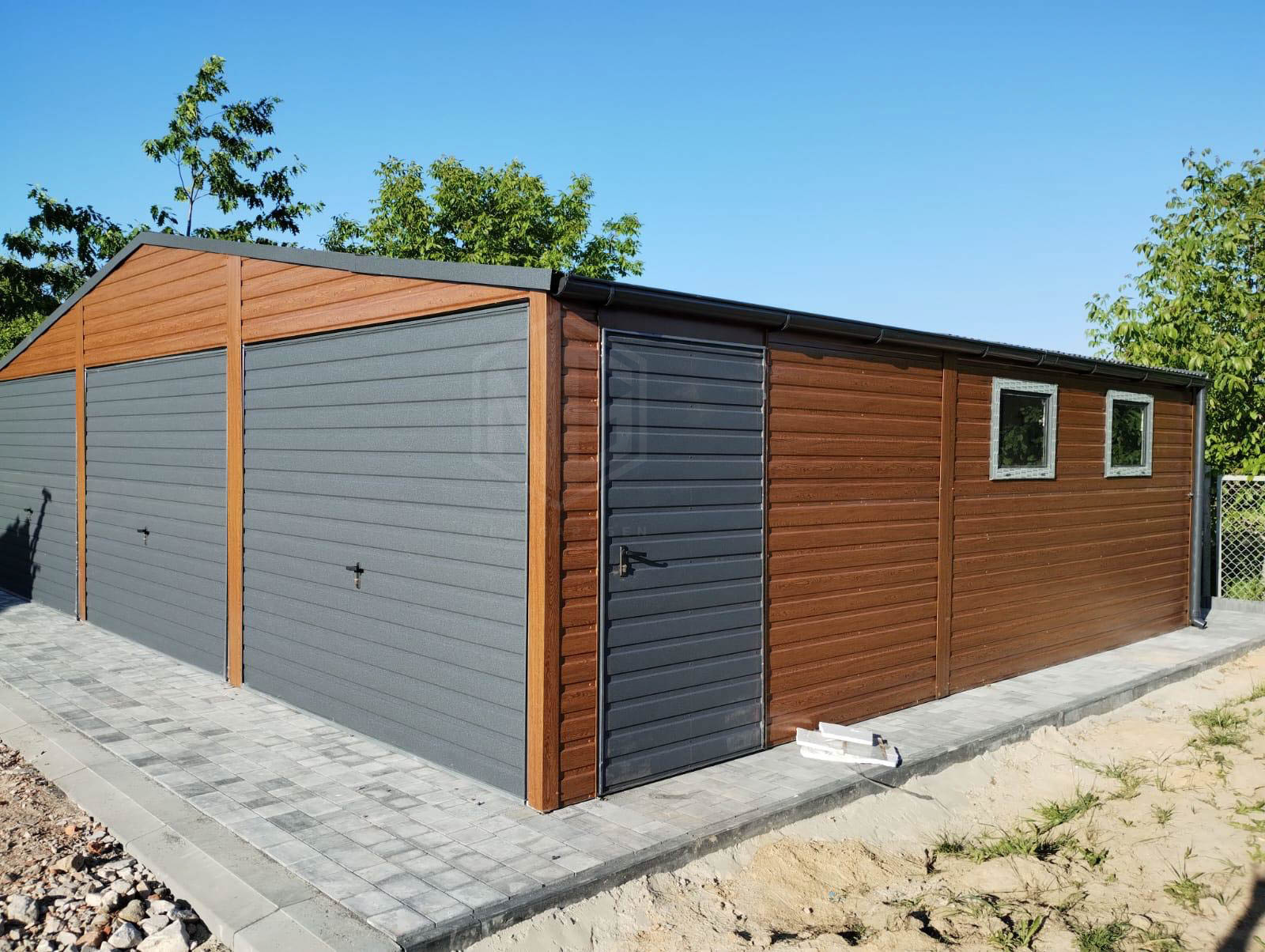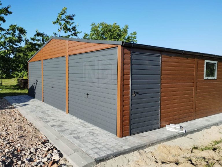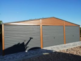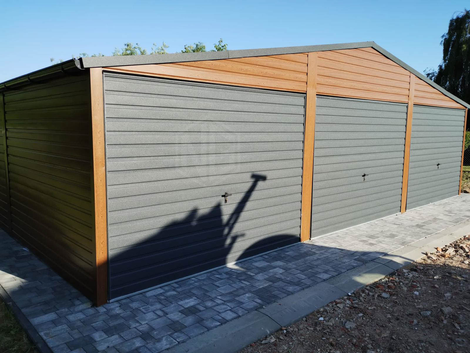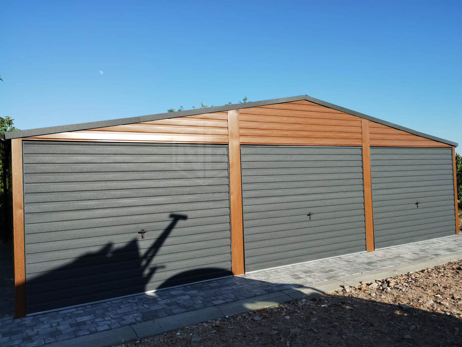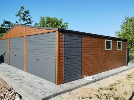 Blechgarage 9x6m Horizontal Blech Dachrinnen 3x Schwingtor 2x PVC Kippfenster Holzoptik ID216